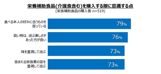 栄養補助食品(介護食含む)を購入する際に意識する点の上位には、味、栄養素含有量、色々な製品を「選ぶ楽しさ」が挙げられています。