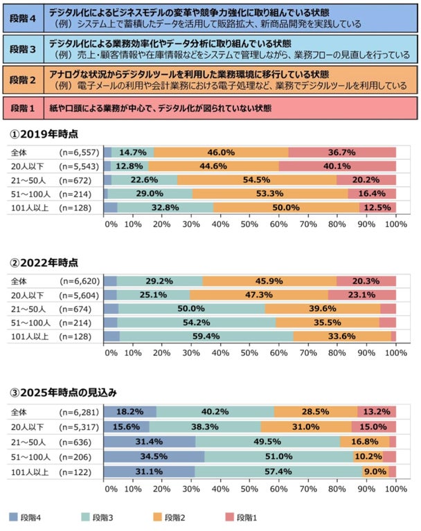 一方、我が国の状況として、コロナ禍で中小企業のデジタル化は進んでいるものの、依然として、20人以下の企業を中心にデジタル化が進んでいない(段階1・段階2まで)という状況が見られます。
