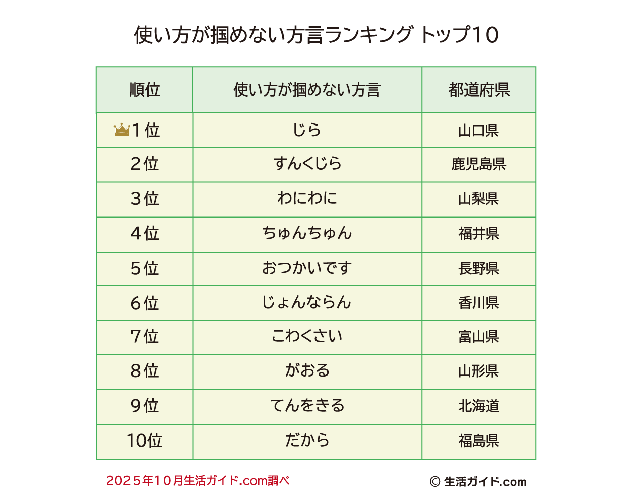 このランキングは、全国の「これ、方言だったんだ!」という言葉を生活ガイド.comが厳選し、クイズ形式(知ってるor知らなかった)で、生活ガイド.com会員に回答してもらいました。知らなかった場合には、その方言に1票が入れられ、知らなかった票が一番多い方言を1位とし「使い方が掴めない方言ランキング」として発表しております。