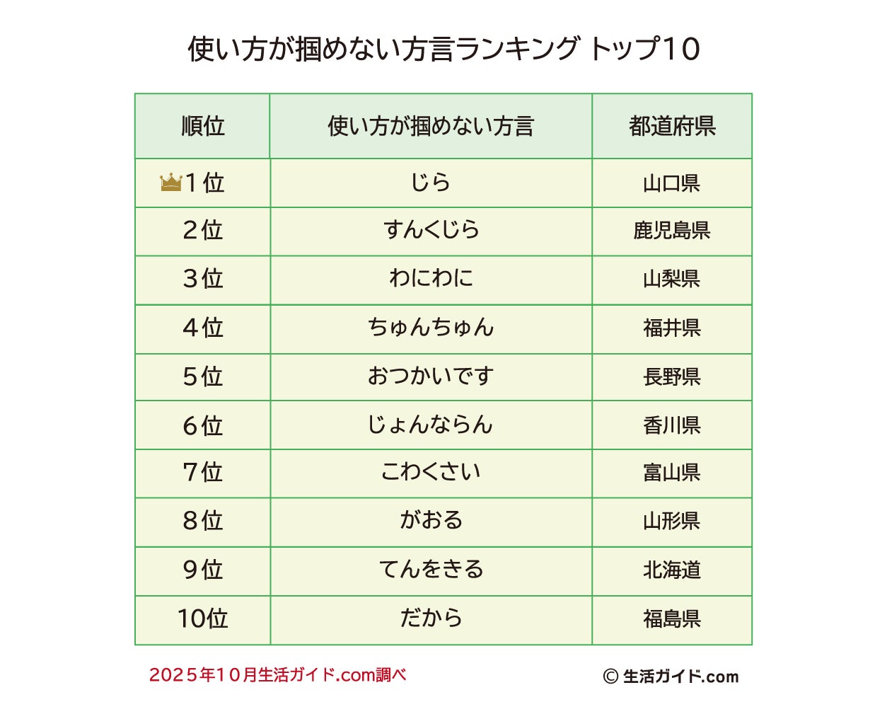 株式会社ウェイブダッシュ(本社:東京都千代田区、代表取締役社長 下山 一美)が運営する、みんなでつくる地域応援サイト「生活ガイド.com」(https://www.seikatsu-guide.com/) は、みんなのランキング第54回「使い方が掴めない方言ランキング」のトップ10を発表いたしました。