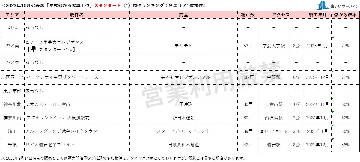 [住まいサーフィン]資産性の保たれやすいマンションがわかる首都圏エリア別「沖式儲かる確率上位マンションランキング」2023年10月版公表