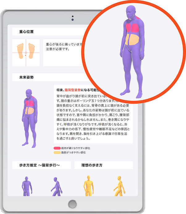 最先端のAI技術を用いた姿勢分析システムにより、重心の偏りや前後左右のゆがみなど、姿勢に関する詳細を数値で評価します。またゆがみの原因となる部位を3Dアバターで分かりやすく可視化するので、普段なかなか客観視できない自分の姿勢について、多くの気づきを得ることができます。