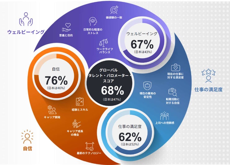 グローバル・タレント・バロメーターは、世界の労働者の「ウェルビーイング」「仕事の満足度」「自信」を測定する指標※です。