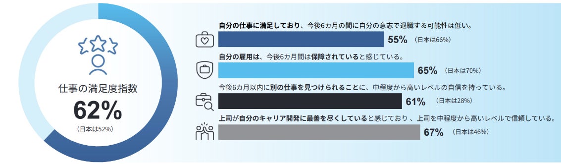 グローバルの仕事の満足度指数は62%に対し、日本は52%となりました。