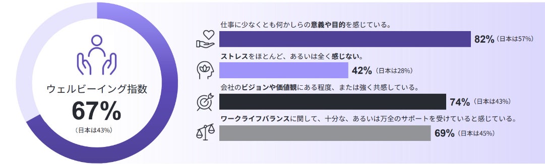 グローバルのウェルビーイング指数は67%に対し、日本は43%となりました。