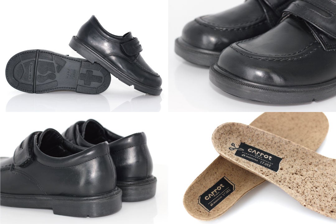 Uチップのコインローファーデザインは入園・卒園や発表会のみならず日常シーンにも馴染む上品な印象の一足です。生産は国内でも数少ないダイレクト製法を有し、1956年から革靴生産を担ってきた佐賀県の自社工場で行っています。Carrotの特徴でもある子どもの足の特徴に合わせた4つの機能(注1)を搭載し、健やかな成長をサポートします。