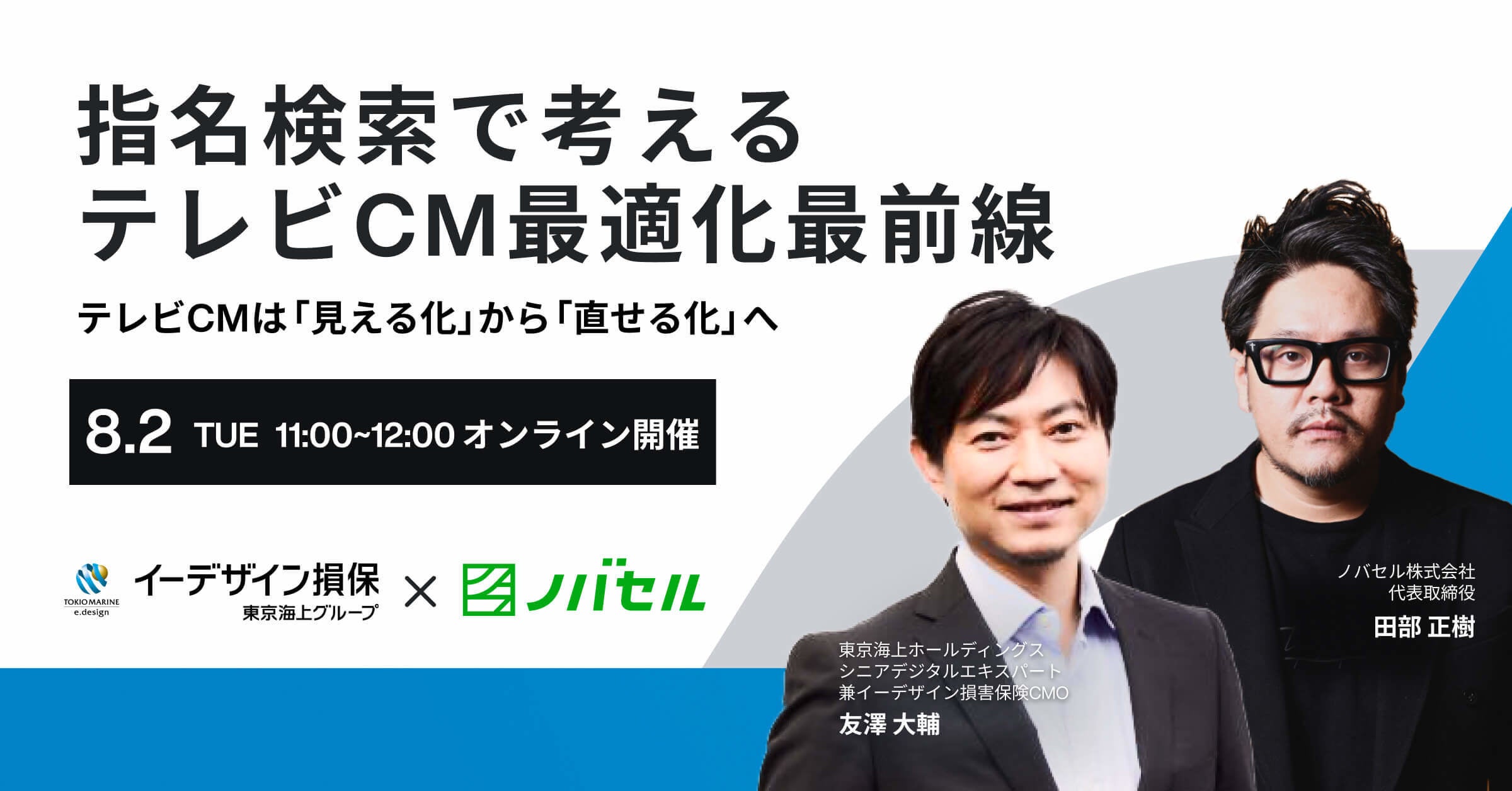 テレビCM効果を見る指標として「指名検索」と答えた企業は3社に1社と調査で明らかになりました。本セミナーでは東京海上ホールディングスシニアデジタルエキスパート兼イーデザイン損害保険 CMOの友澤 大輔氏、ノバセル株式会社代表取締役社長/ラクスル株式会社取締役CMO 田部正樹が登壇し、「指名検索」起点でテレビCM戦略をどのように考えるべきか、イーデザイン損保でのテレビCM分析をどのように「見える化」から「直せる化」に組み立てたのかを徹底解説いただきます。
