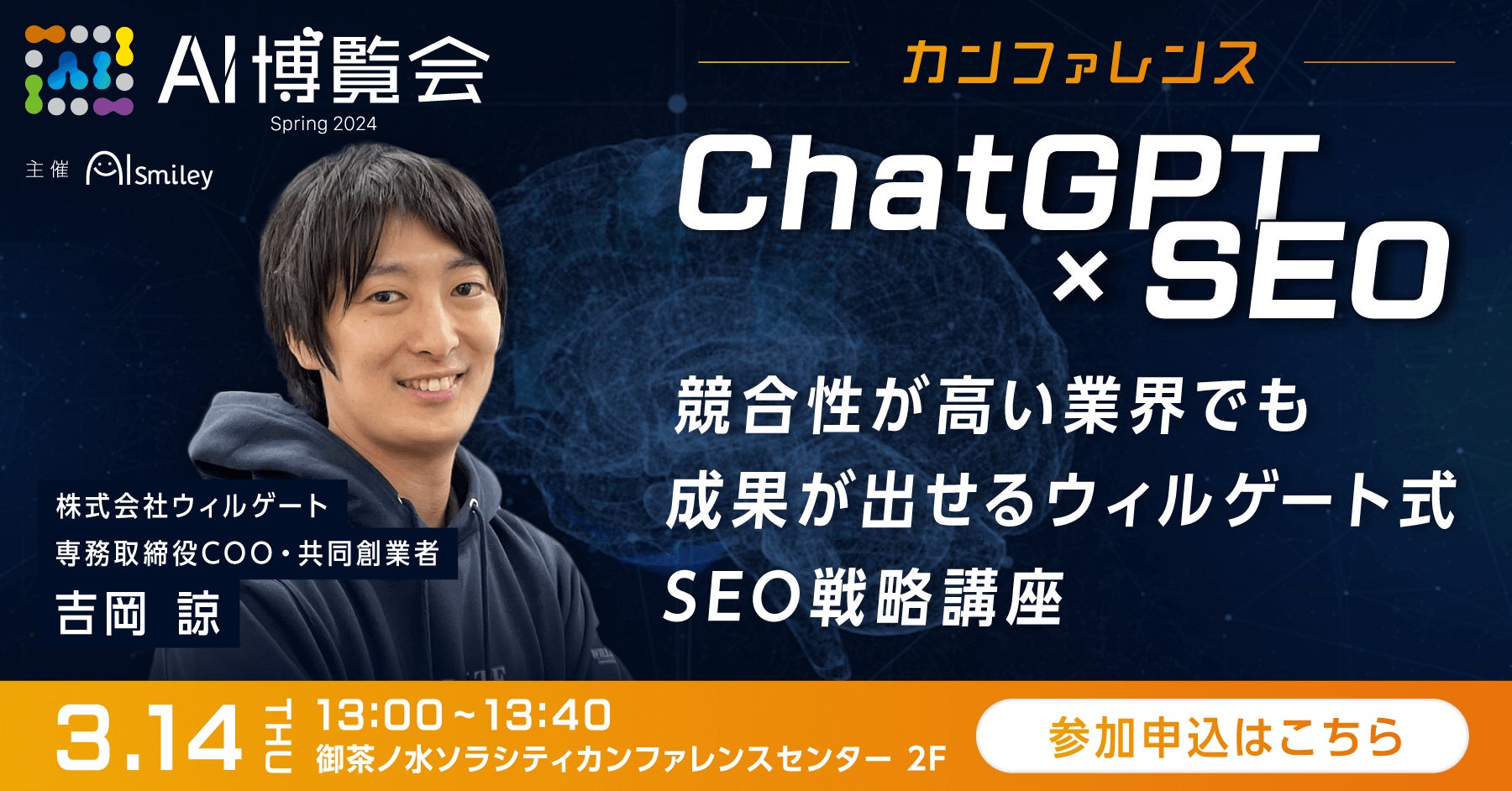 株式会社ウィルゲート(本社:東京都港区、代表取締役CEO:小島 梨揮、以下「ウィルゲート」)は、株式会社アイスマイリー(本社:東京都渋谷区、代表取締役:板羽 晃司)が主催する『AI博覧会 Spring 2024』にて《【ChatGPT×SEO】競合性が高い業界でも成果が出せるウィルゲート式SEO戦略講座》をテーマに登壇いたします。(申し込み先:https://ai.aismiley.co.jp/form/1-D_ai_hakurankai_2024_spring_conference?k3ad=wg )