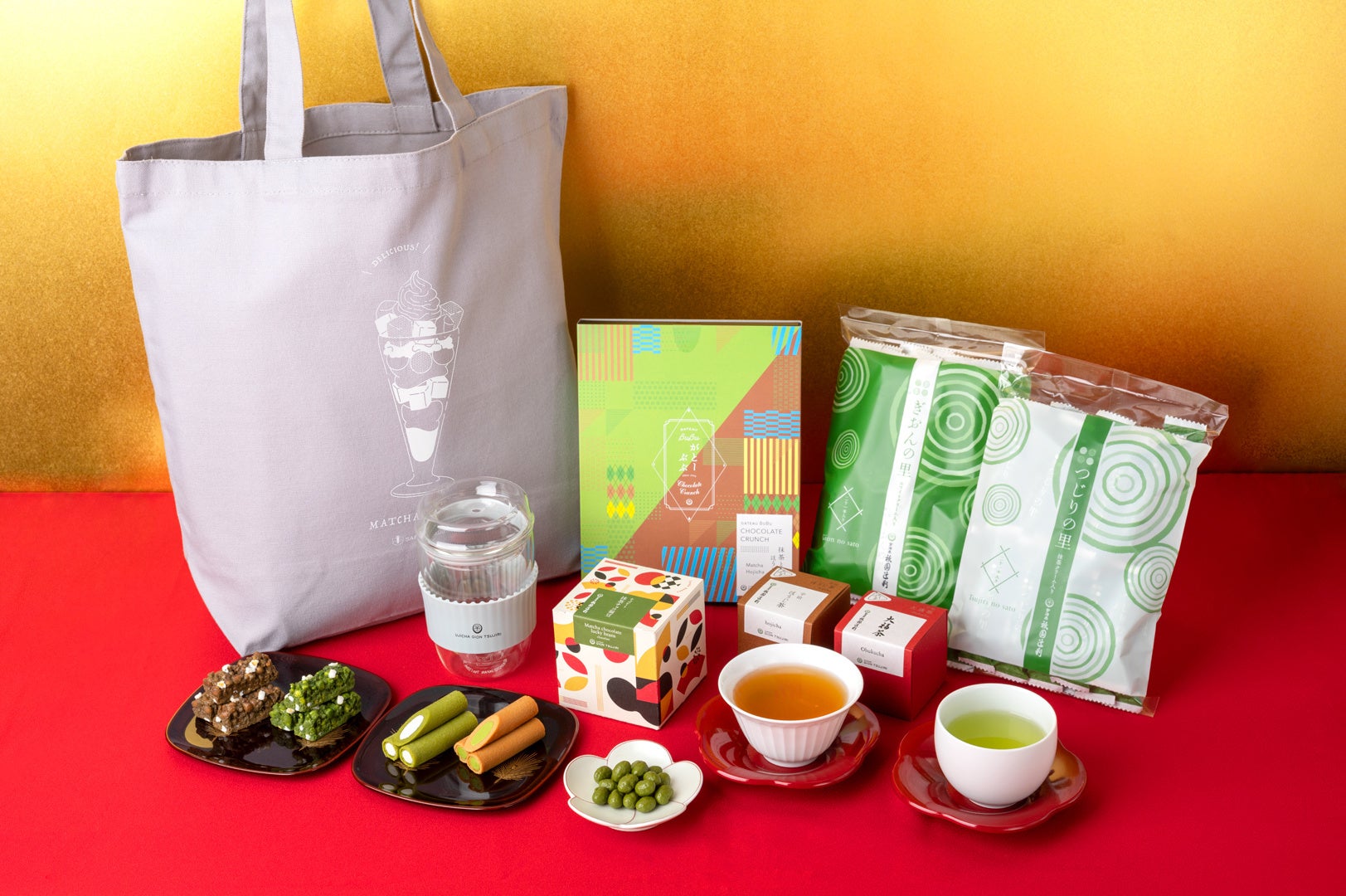 なかでもおすすめは、京都に受け継がれる新年の縁起物「大福茶」とお茶の鮮やかな色を楽しめる220mlのオリジナルタンブラーや「抹茶チョコ福豆」。香り高いほうじ茶や、定番の「つじりの里」、「ぎおんの里」を添えて新年にほっこりとしたひとときをお過ごしください。
