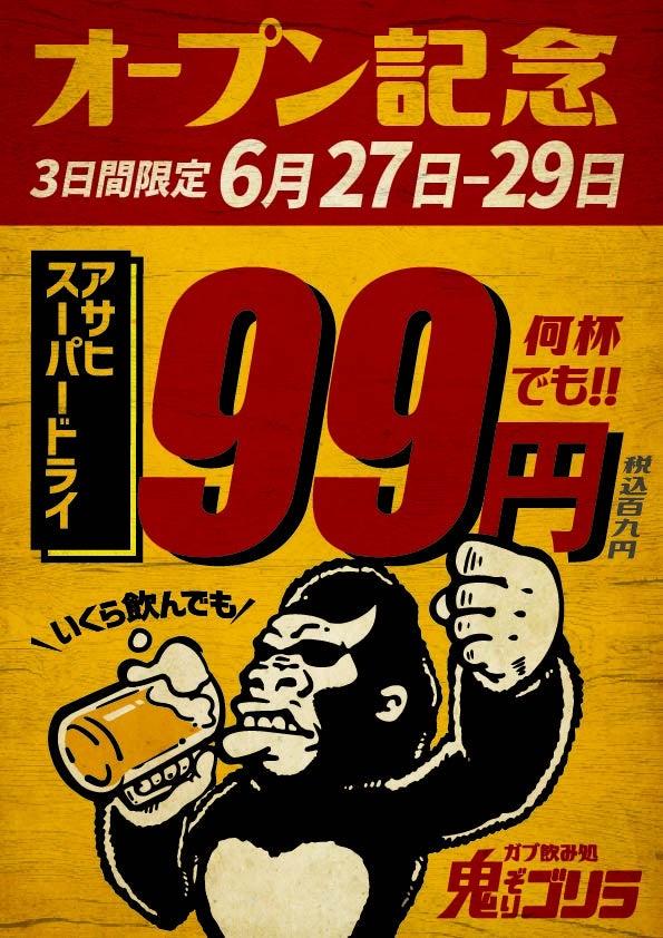 めった遊べるストリートな大人の溜まり場「ガブ飲み処 鬼ぞりゴリラ」が群馬は高崎に初上陸!6月27日グランドオープン!OPEN記念で27日・28日・29日の三日間はスーパードライ中ジョッキが99円!