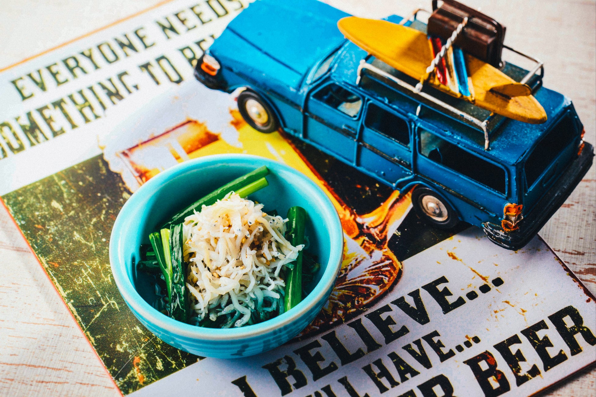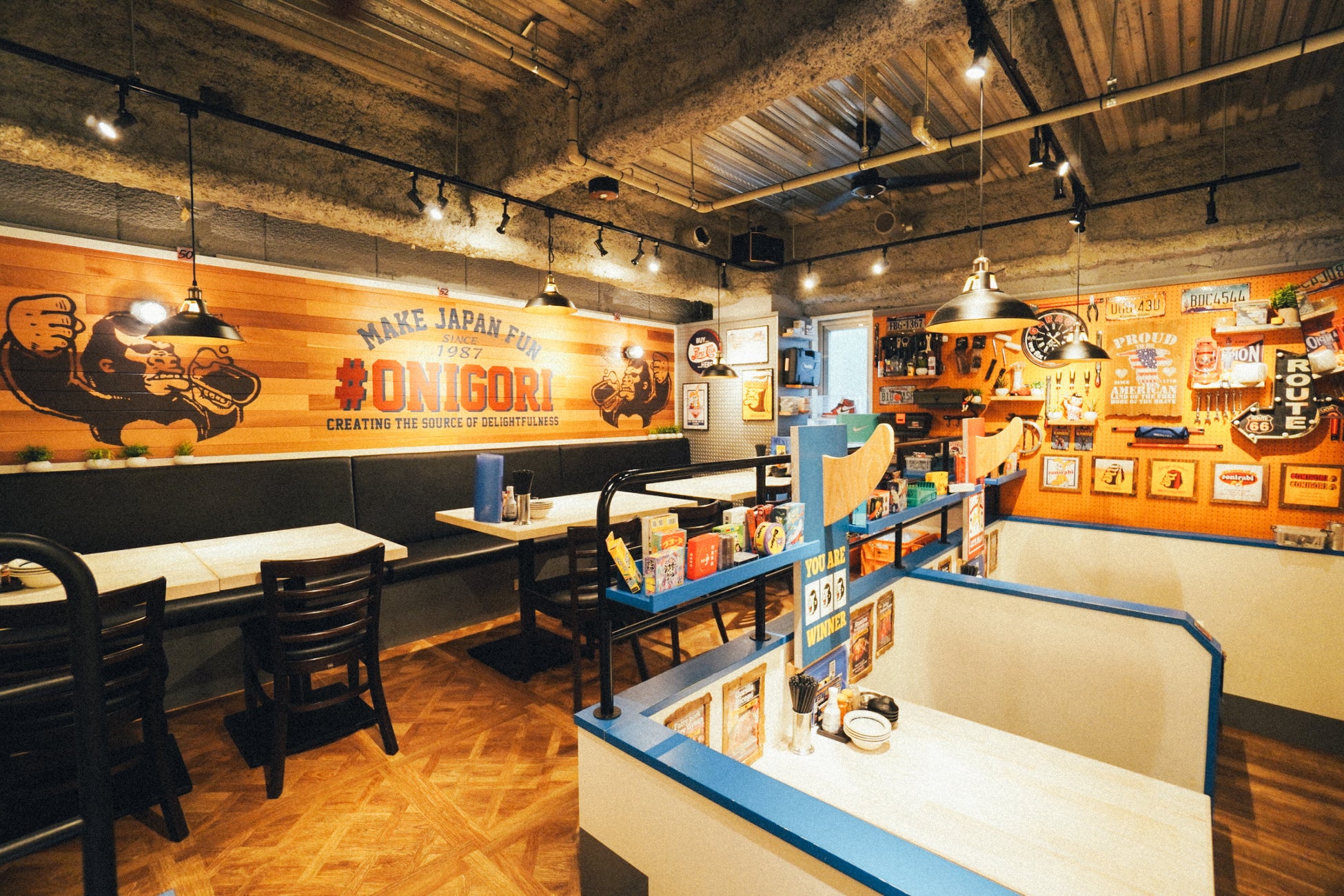 大人の溜まり場として、店内はスケボーや趣味の工具が飾られるカリフォルニアガレージを意識。まさに倉庫のような広々とした店内は「ダベる」居心地の良さを考えて座席もゆったりめに。