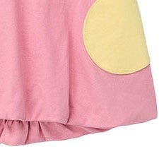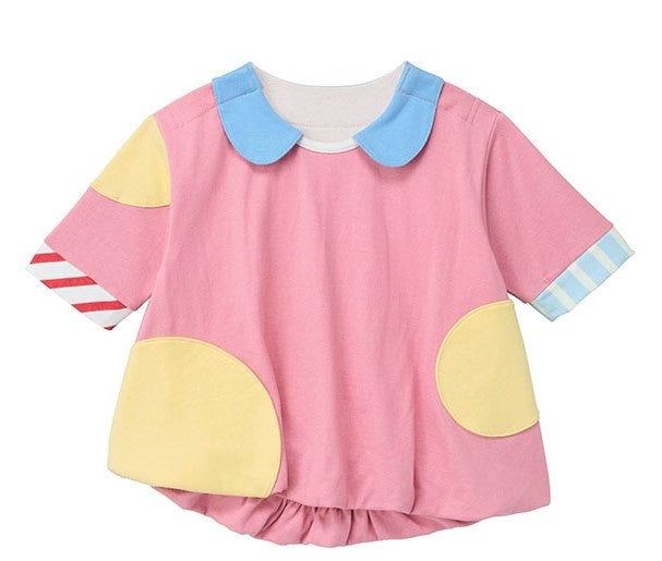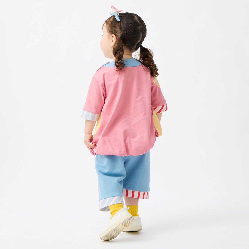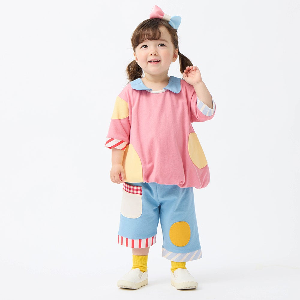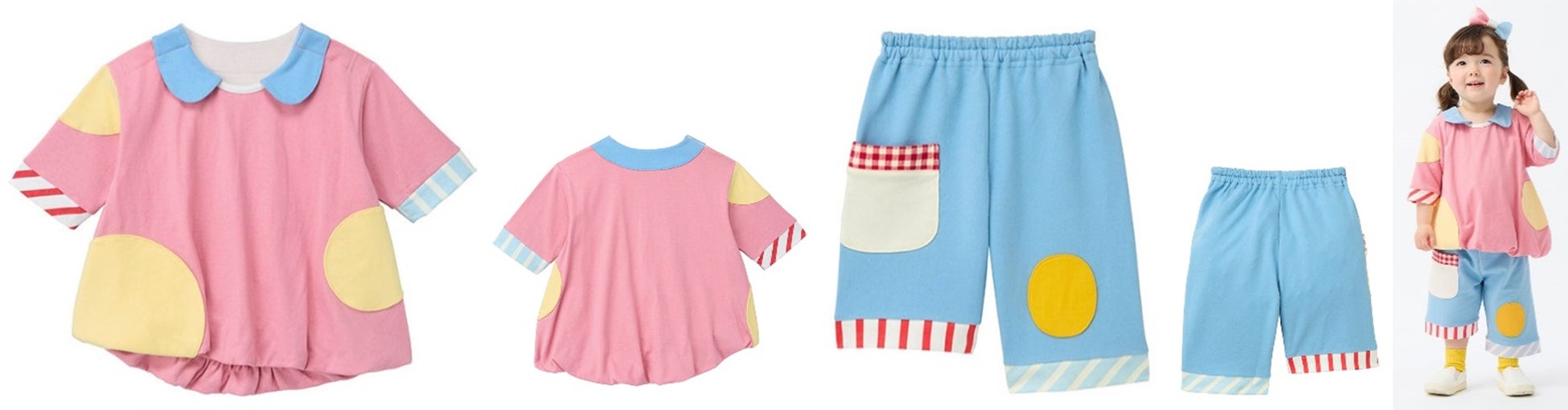 「5代目スイちゃんになれる!トップス&ボトムセット」は、どの角度から見てもスイちゃんになれるよう、衣装のデザインや色合いを細部まで忠実に再現しました。トップスはアシンメトリーの裾とバルーンシルエットで立体的のあるデザインを採用し、前身頃から後見頃にわたる部分には、大きなアップリケを付けています。パンツは左右の長さが違うデザインで本物のスイちゃんに近くなるように着用時のバランスにこだわりました。見た目の可愛さだけでなく、綿100%の動きやすく快適なカットソー素材を使用するなど、子どもの着やすさにも配慮しています。