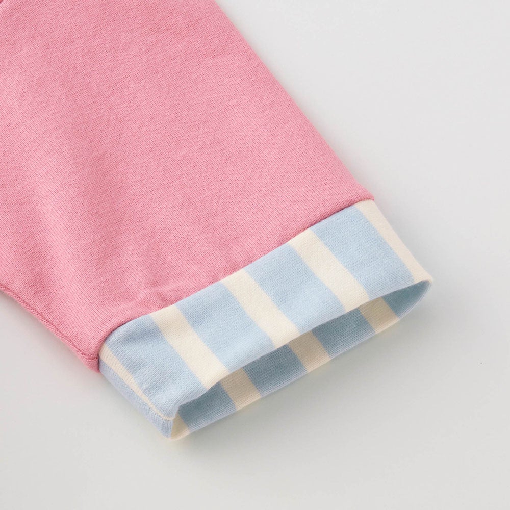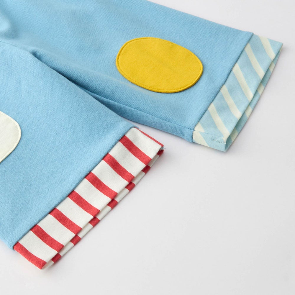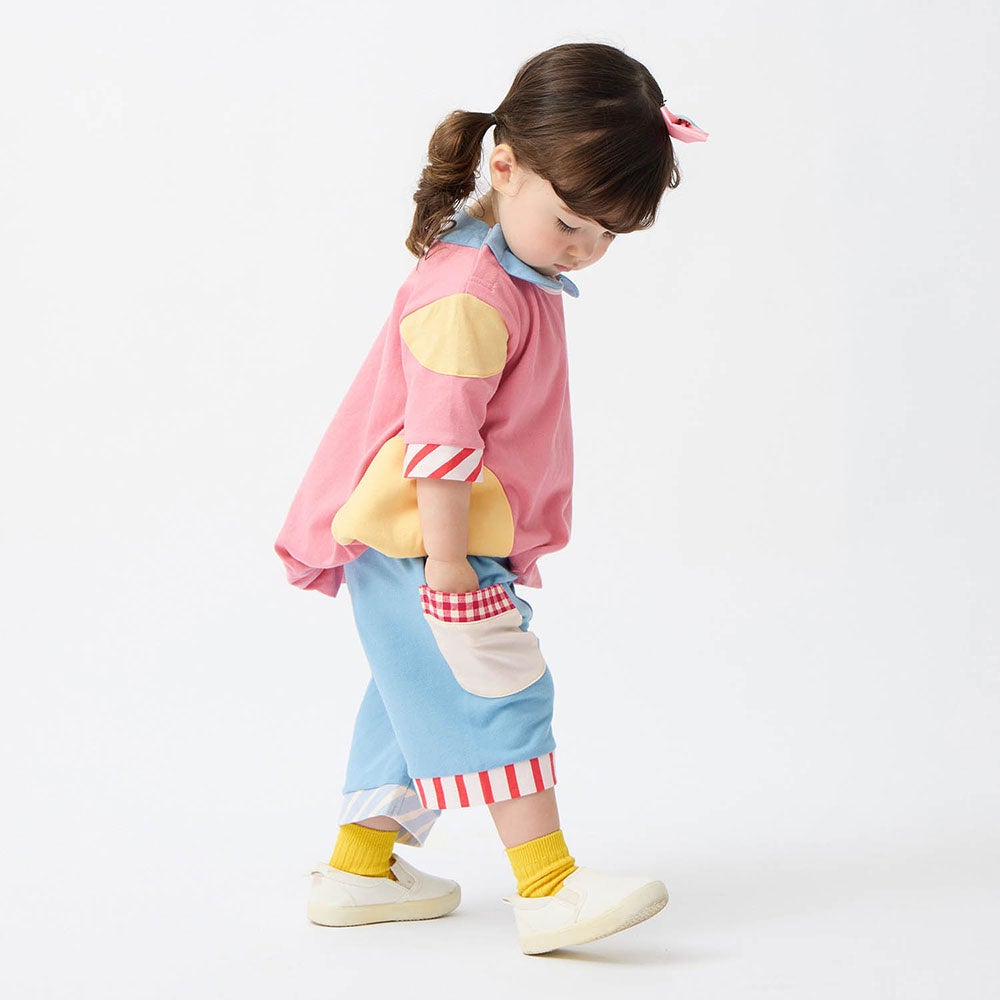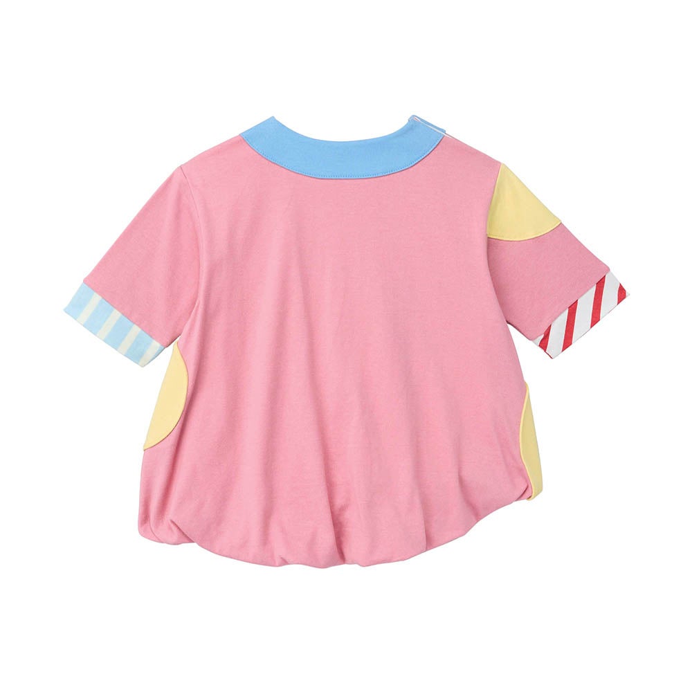 「5代目スイちゃんになれる!トップス&ボトムセット」は、どの角度から見てもスイちゃんになれるよう、衣装のデザインや色合いを細部まで忠実に再現しました。トップスはアシンメトリーの裾とバルーンシルエットで立体的のあるデザインを採用し、前身頃から後見頃にわたる部分には、大きなアップリケを付けています。パンツは左右の長さが違うデザインで本物のスイちゃんに近くなるように着用時のバランスにこだわりました。見た目の可愛さだけでなく、綿100%の動きやすく快適なカットソー素材を使用するなど、子どもの着やすさにも配慮しています。