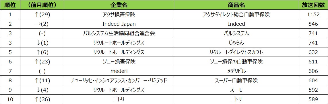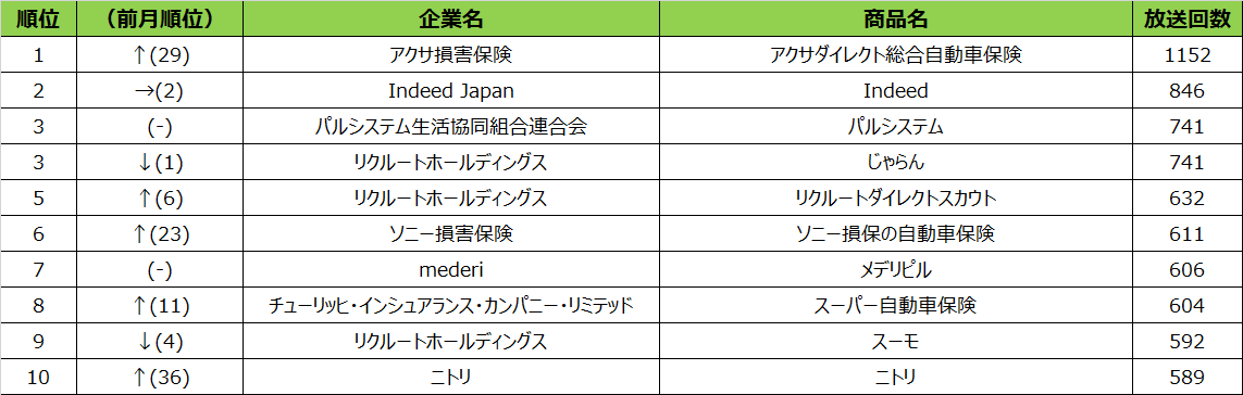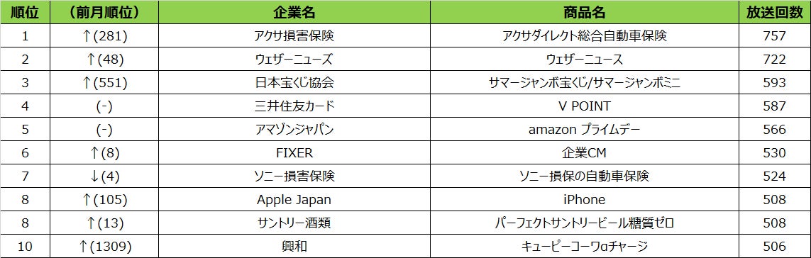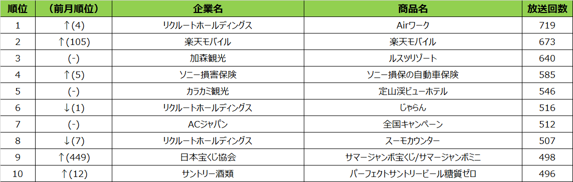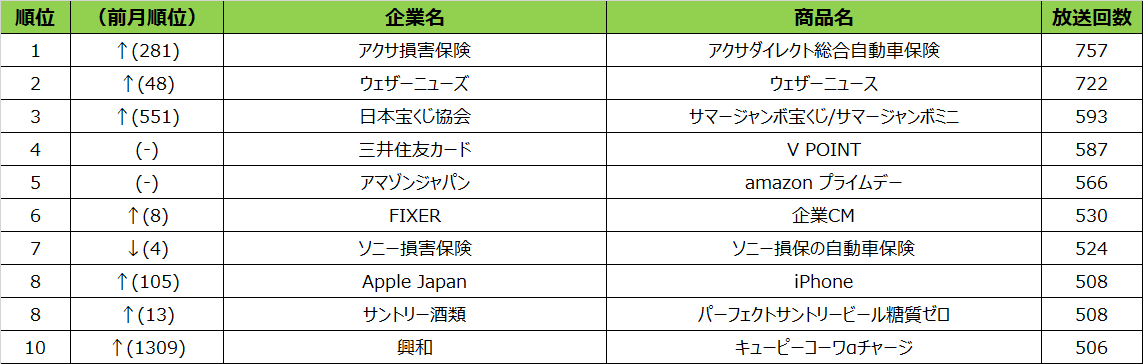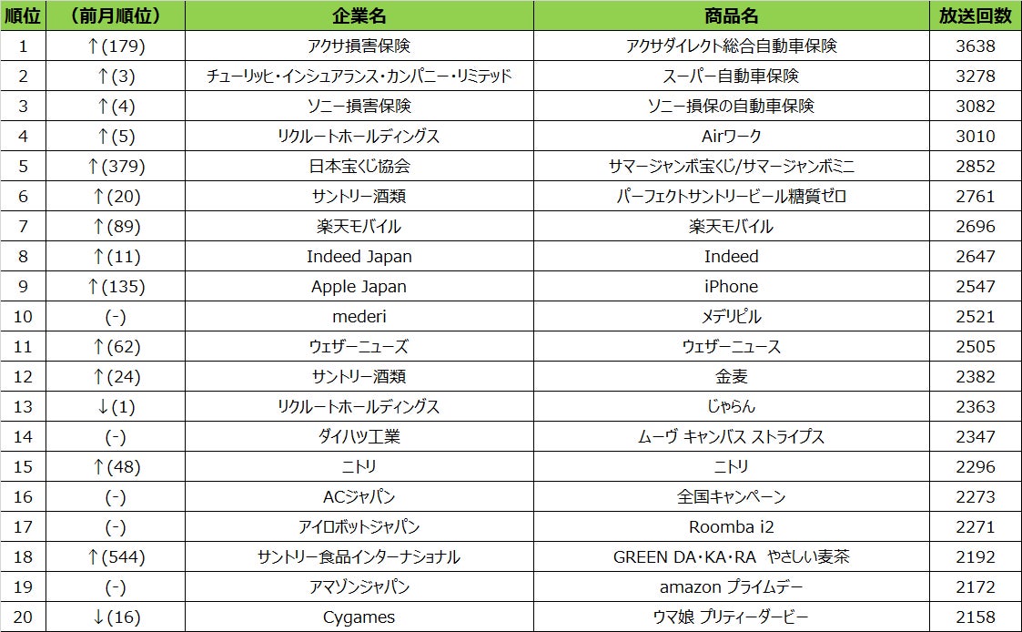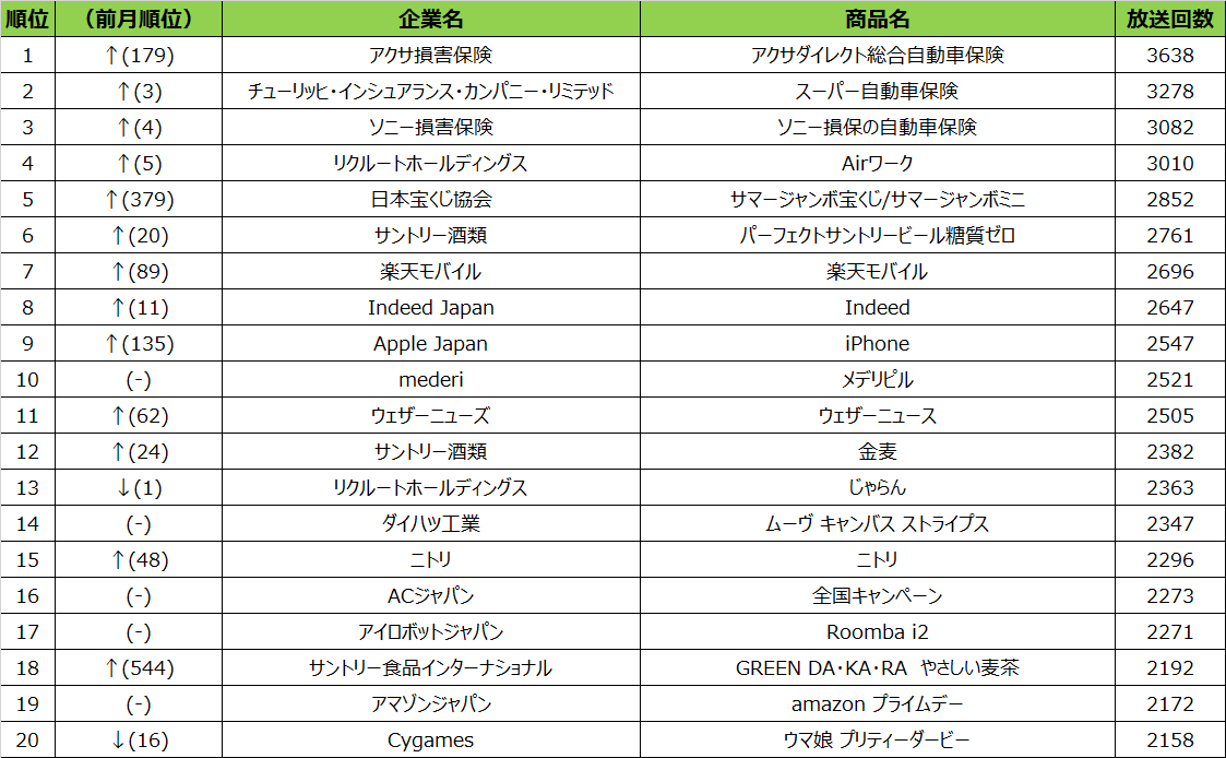 また、7月度は政界を揺るがす大きな事件があり、CM出稿を自粛する企業が多く、その代わりとしてACジャパンのCMが大量に出稿され、16位にランクインする結果となりました。
