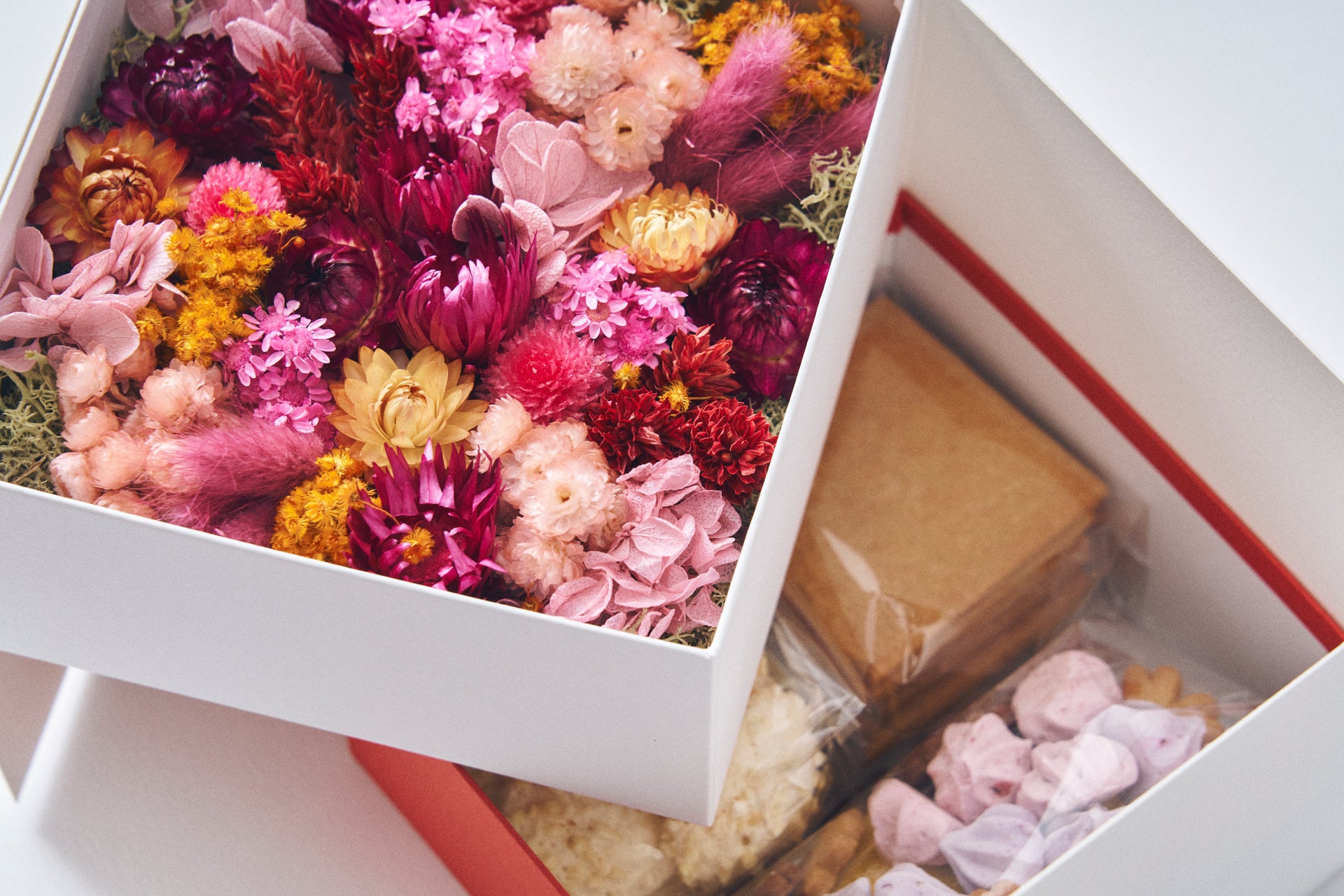 パッと目を引く色とりどりのドライフラワーやプリザーブドフラワーを使用した優美で心弾むボックスアレンジメントに、お花のイメージに合わせて作り上げた多彩な焼き菓子を組み合わせ。スイーツとお花が一緒に楽しめるうれしいギフトです。食べ終わったあとも“飾れる小物入れ”として長くご利用頂けます。ふたを開けた瞬間、思わず「わぁ〜」と歓声があがる、嬉しいサプライズに。お母さんの笑顔を咲かす、母の日らしいスイーツギフトです。