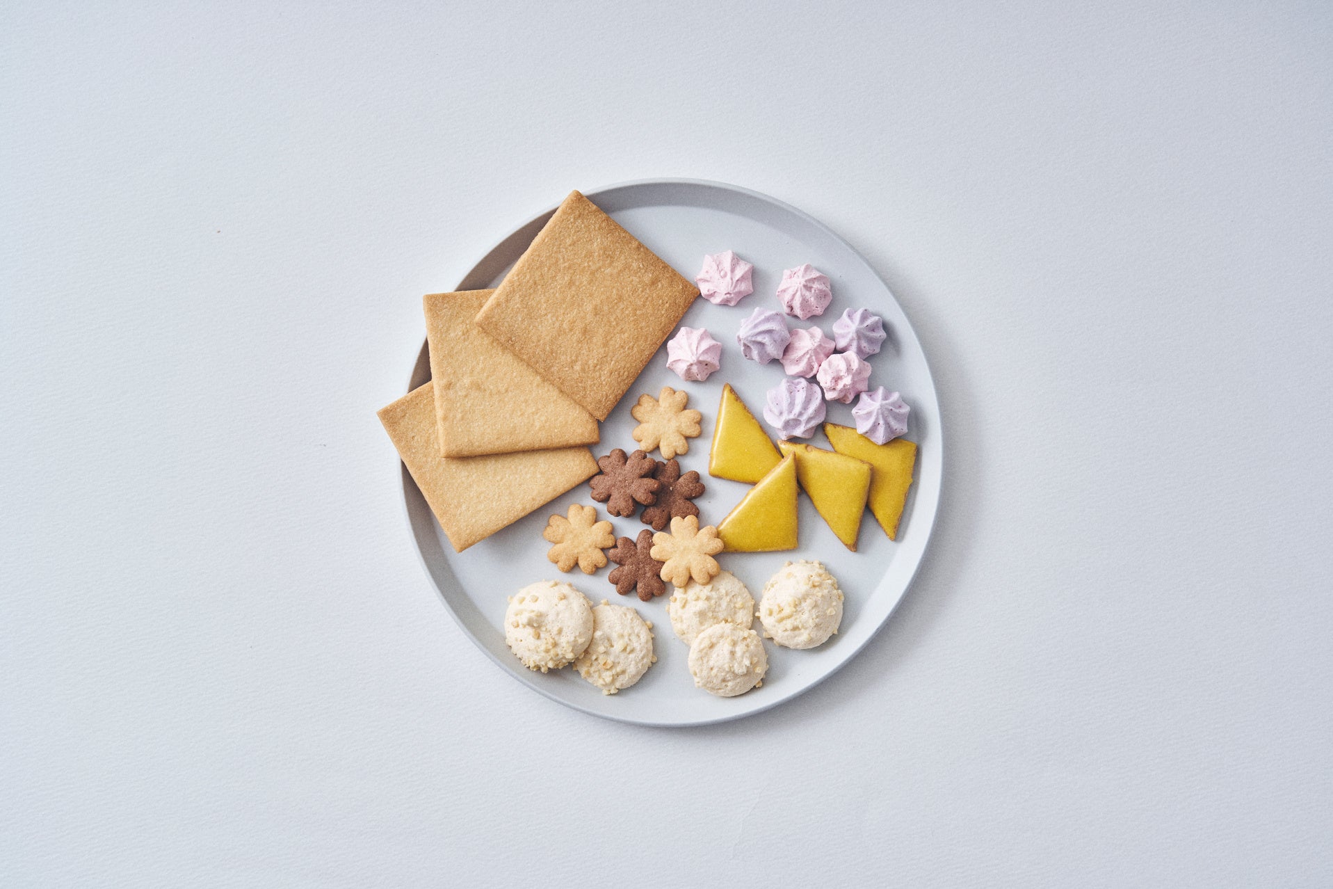 お花形のプレーンクッキーやカカオクッキー、レモンアイシングクッキーに、カシスオレンジ味やいちごラズベリー味のメレンゲを組み合わせた、色とりどりの焼き菓子を詰め合わせ。