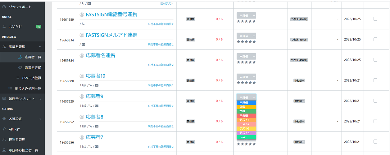 応募者に対して任意で評価(デフォルトでは未評価・保留・合格・不合格)を付けることが出来ます。 評価を付けると、該当の応募者のみを検索するといった絞り込みが可能になります。 例)合格者のみを絞り込んで検索する 等