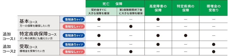 従来の死亡保障・高度障害保障*のみのタイプを「基本コース」とし、ニーズに応じて追加で選択いただけるよう、「特定疾病保障コース」、「受取コース」の2つのコースを追加します。