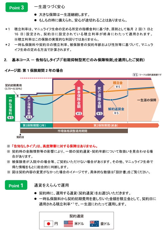 マニュライフ生命保険株式会社(取締役代表執行役社長兼CEO:ブノワ・メスレ、本社:東京都新宿区、以下「マニュライフ生命」)は、お客さまの特定疾病保障ニーズならびに、契約を継続しつつ積立金を一部引き出す資金ニーズにお応えするために、金融機関向けの通貨選択型一時払終身保険『未来につなげる終身保険v2』の商品改定を行い、2025年4月1日(火)から販売開始いたします。