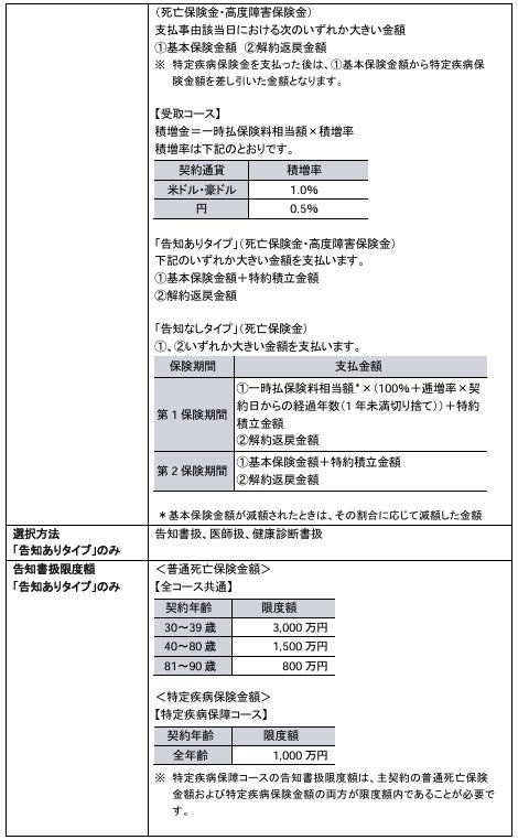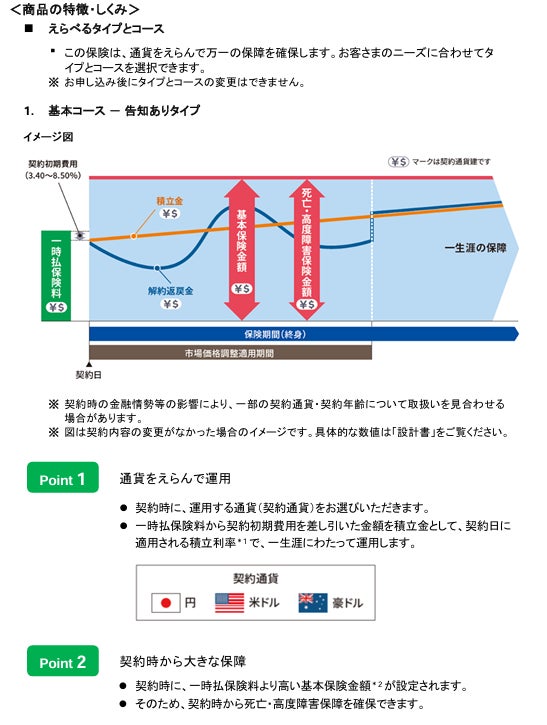 『未来につなげる終身保険v2』は、「告知ありタイプ」「告知なしタイプ」の2つのタイプから選択いただき、一生涯の死亡・高度障害保障*を確保することができる一時払終身保険であり、少しでも多くの資産を安心してご家族にのこしたいお客さまをサポートする資産形成機能も備えた商品です。契約通貨は、円・米ドル・豪ドルからお選びいただけます。このたび、より幅広くお客さまのニーズにお応えするため、以下の商品改定を行います。