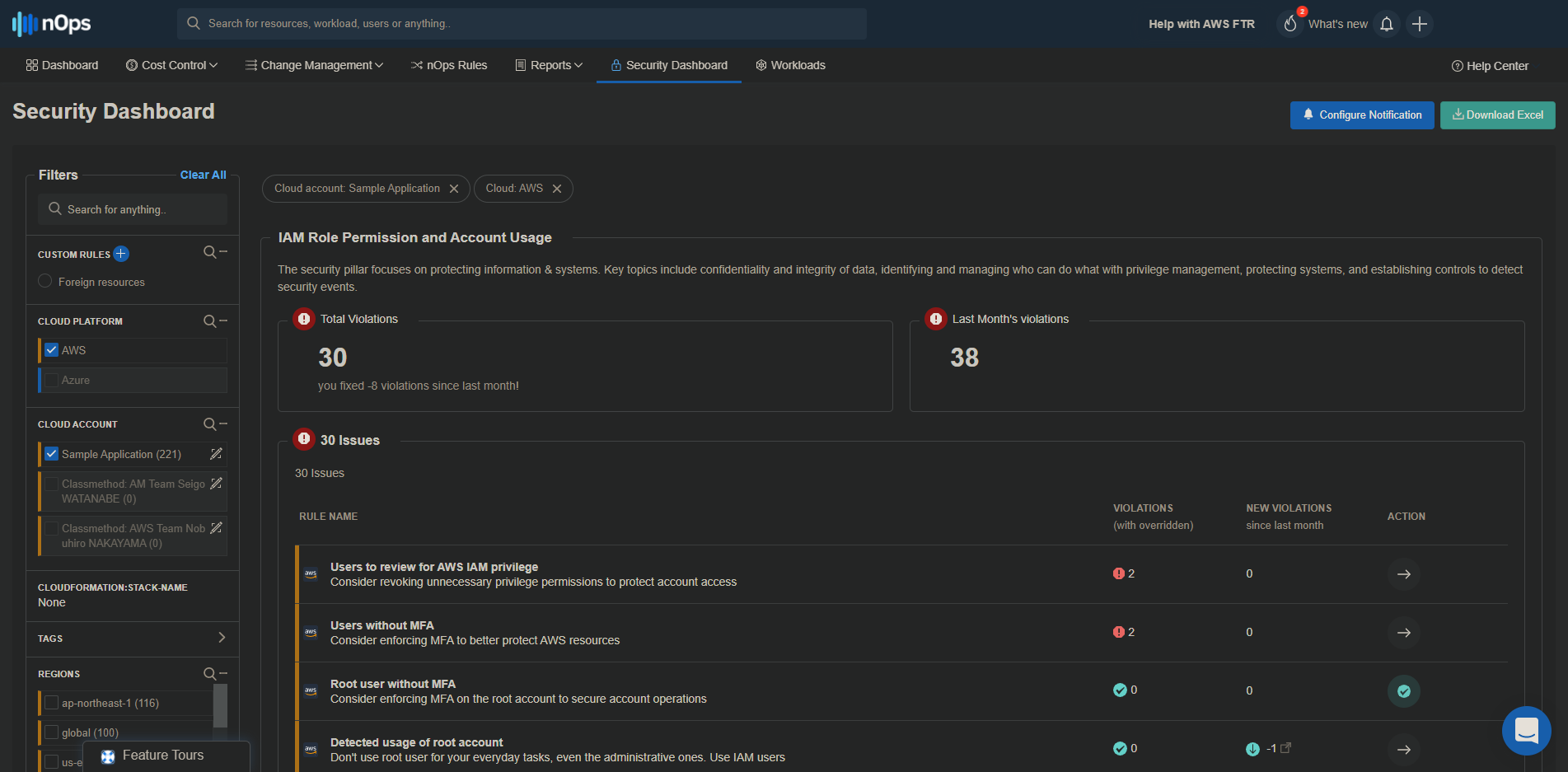 nOpsは、AWS Well-Architectedフレームワークにおける5つの観点、「運用の優秀性」「コスト」「信頼性」「セキュリティ」「パフォーマンス」にて、複数のAWSアカウントの状態を一元的に評価し、問題があればユーザーに通知する機能をもちます。