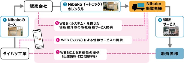 「Nibako」は本日より、4販売会社(ダイハツ東京販売株式会社、埼玉ダイハツ販売株式会社、ダイハツ千葉販売株式会社、京都ダイハツ販売株式会社)を中心に地域を限定して提供を開始し、順次地域を増やし全国規模への拡大を目指します。また、今後移動販売用以外のNibakoの開発も行う他、事業の更なるサポートや、アプリサービスによる情報提供も随時充実させていきます。
