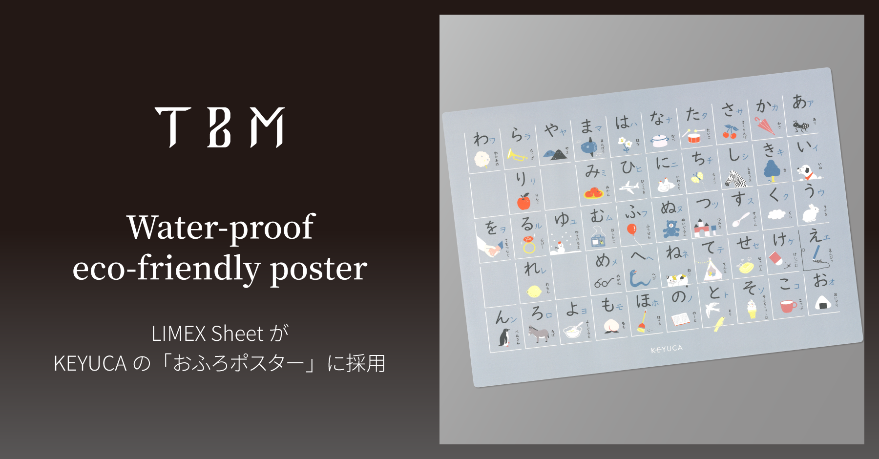 株式会社TBM(本社:東京都千代田区、代表取締役CEO:山﨑敦義、以下TBM)の石灰石を主原料とする「LIMEX Sheet(ライメックスシート)」80μmが、河淳株式会社(本社:東京中央区、代表者:河崎淳三郎、以下河淳)が運営するライフスタイルショップ「KEYUCA(ケユカ)」のオリジナル「おふろポスター<ひらがな>」に採用されました。全国69店舗*とKEYUCAのオンラインショップで販売されます。