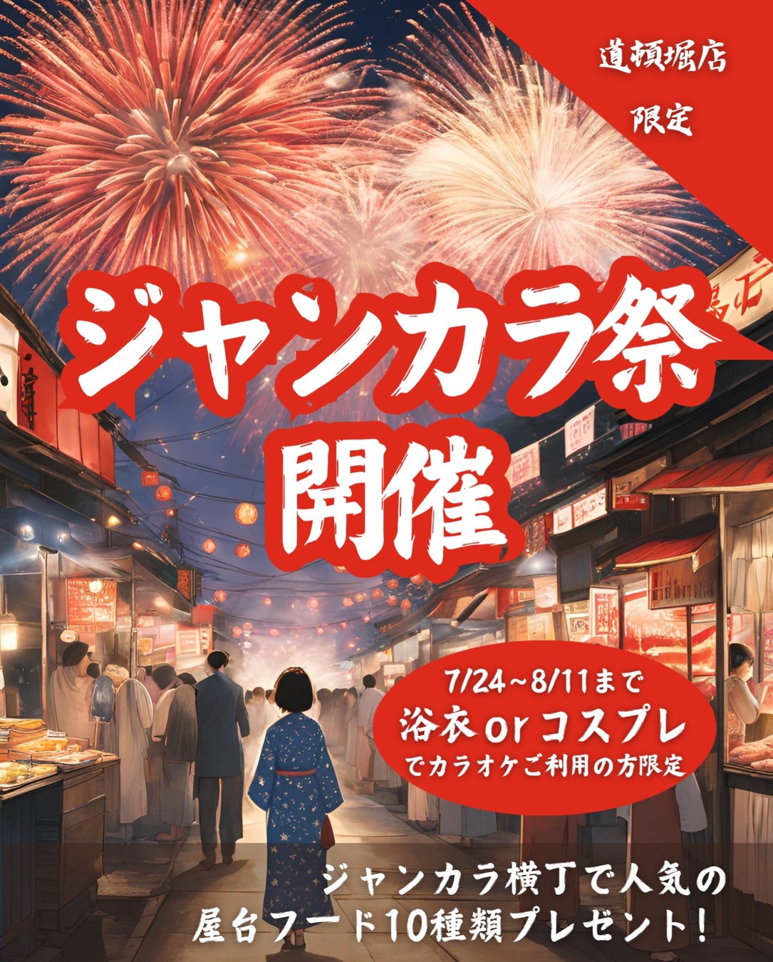 全国で180店舗を展開し、西日本においてカラオケチェーン業界最大規模を誇るジャンカラは、大阪府大阪市の道頓堀店にて夏ならではの特別企画「ジャンカラ祭」を本日から8月11日(日)まで開催いたします。