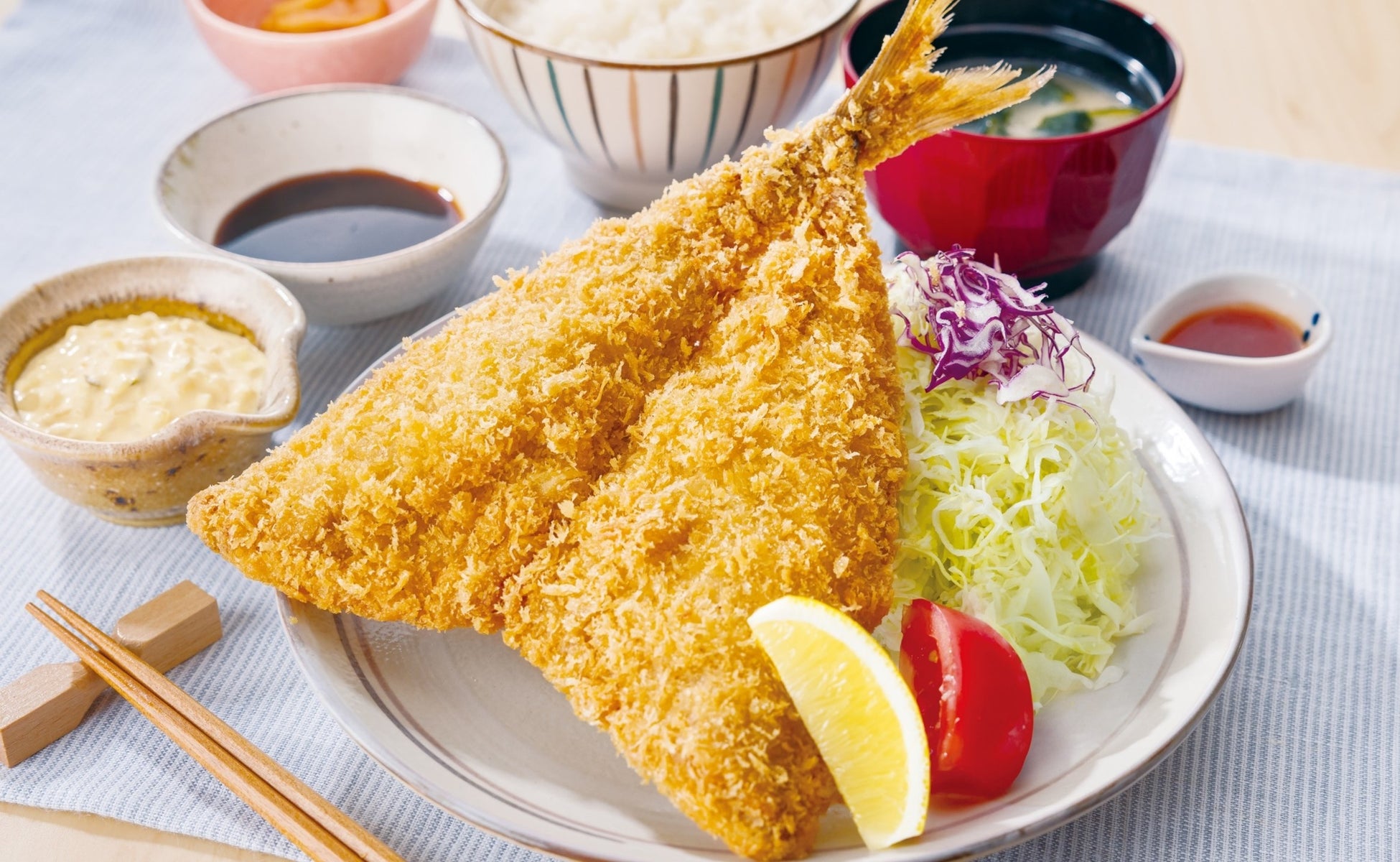 大戸屋こだわりのアジフライは、ご注文を受けてから、最適な揚げ時間と温度を守り、一番美味しく仕上がるように揚げています。衣はサクッと、中はふわっと、身厚なのでふんわりホクホク。タルタルソース、中濃ソースのどちらにもよく合います。味・大きさ・食べ応えにこだわった、大戸屋ならではの「真アジの大判アジフライ」です。