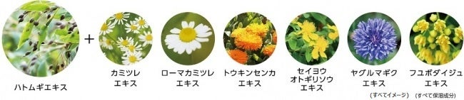 1.ハトムギエキス+6種のハーブエキス(すべて保湿成分)配合。やさしいハーブの香り。