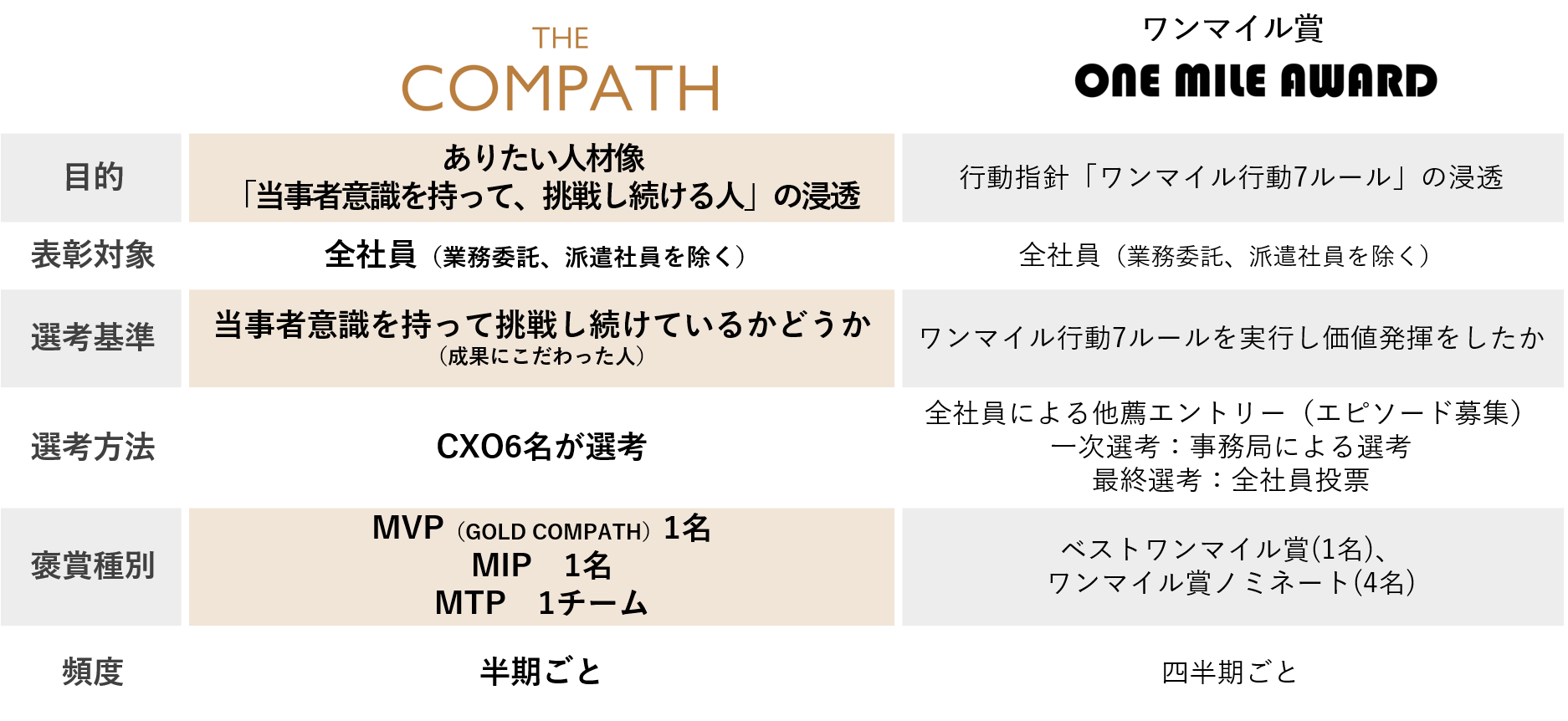 「THE COMPATH」が、ありたい人材像の浸透を目的に、CXO(役員クラス)が選考するトップダウン式の社内表彰制度であるのに対し、「ワンマイル賞」は全社員による推薦・投票で選ばれるボトムアップ式の社内表彰制度です。