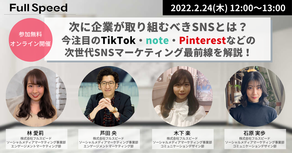 インターネットマーケティング支援を行う株式会社フルスピードは、「次に企業が取り組むべきSNSとは?今注目のTikTok・note・Pinterestなどの次世代SNSマーケティング最前線を解説!」と題した無料オンラインセミナーを2022年2月24日(木)12時より開催いたします。