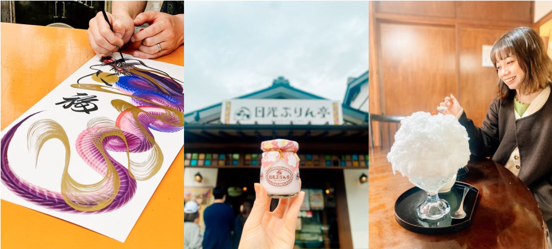 世界遺産の日光東照宮をはじめ、『一筆龍晄秋家(ひとふでりゅうこうしゅうや)』の土産や、『日光さかえや 揚げゆばまんじゅう本舗』、『プリン専門店 日光ぷりん亭』、『1年中食べられる日光の天然氷のかき氷屋 日光茶屋』などのご当地スイーツなどを紹介しています。(敬称略)