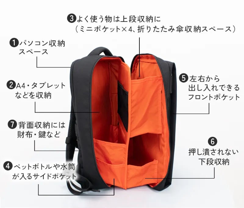 A4サイズの資料やパソコン、ペットボトル、名刺などの小物まで、何かと持ち物が多いビジネスシーンでも、6種類の多様なポケットで大小問わず収納することが可能で、いつでもサッと取り出せて生産性を向上させます。