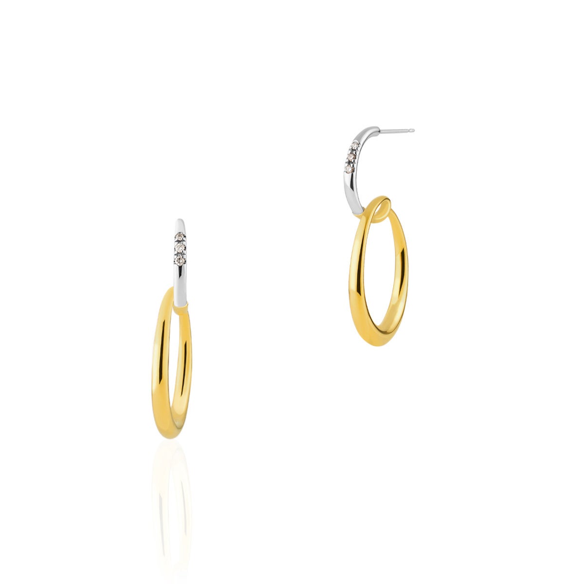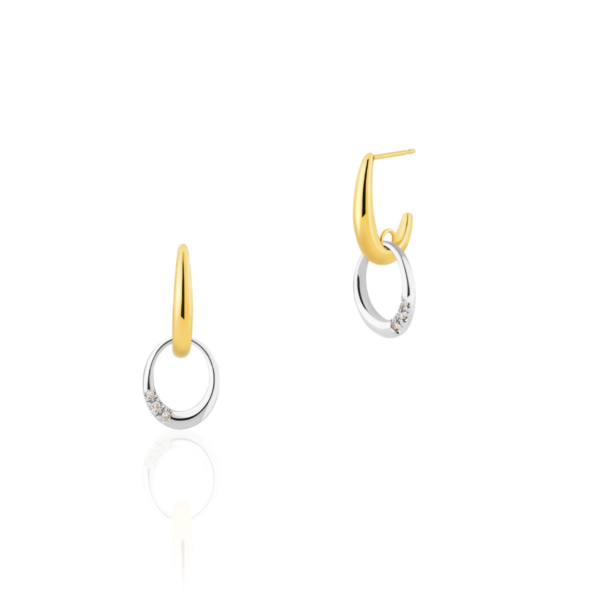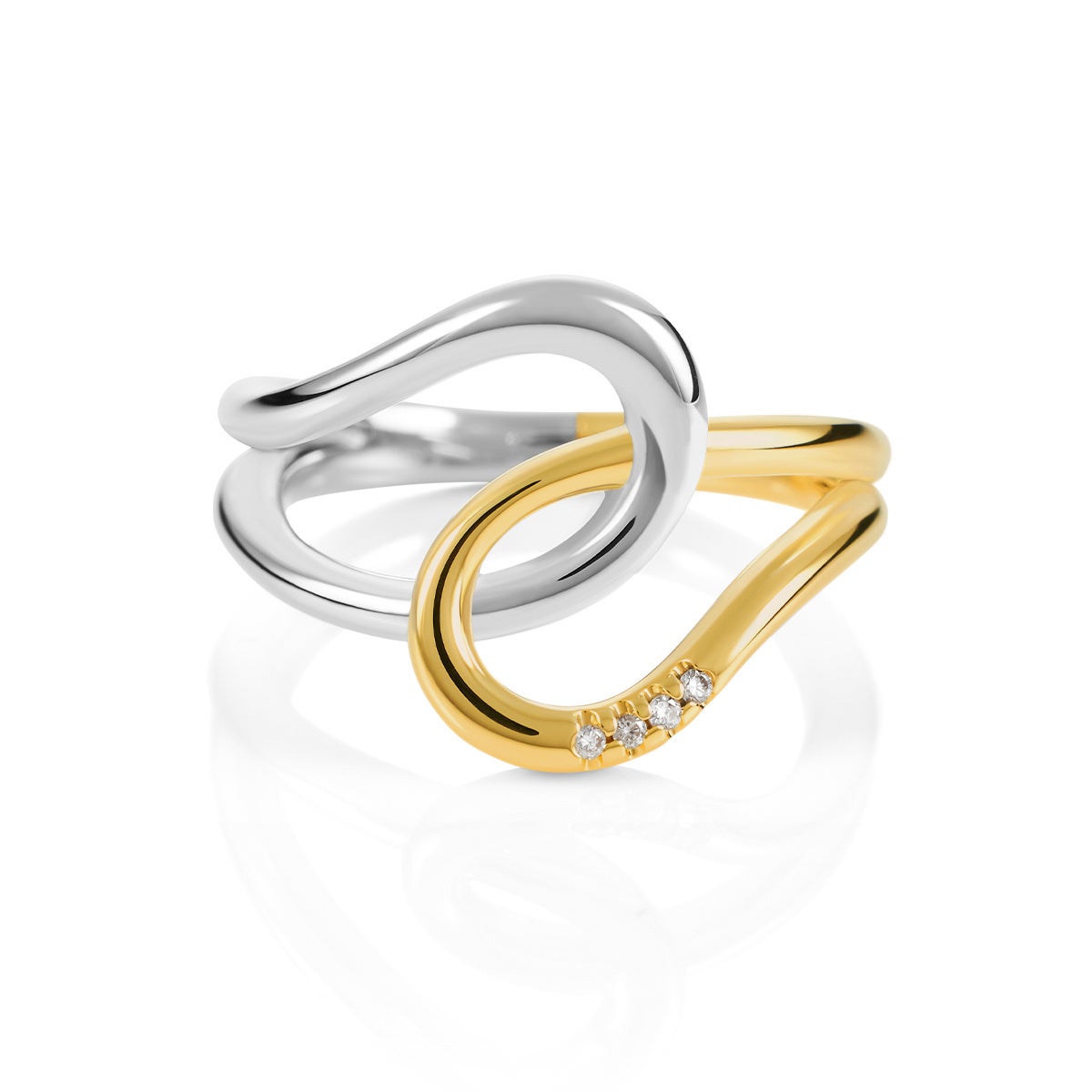 コンビカラーのしずくのモチーフがクロスするボリューム感のあるネックレスやピアスは、身に着ける人の動きに合わせて軽やかに揺れる主役級ジュエリー。水の躍動感をイメージした抑揚のあるしなやかな地金に、アクセントとしてセッティングされたダイヤモンドの輝きが上品な印象を与えます。シルバーとゴールドの織りなすモードなこなれ感が、カジュアルな装いにも、上品さをプラスオンするシーンを選ばないアイテムです。