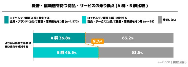 本調査では、「企業・ブランドのロイヤルティ顧客群(A群)」「商品・サービスのロイヤルティ顧客群(B群)」に分類・比較することでアプローチのヒントを入手。例えば、B群の46.5%が安価であれば乗り換えを検討すると回答した設問でA群の63.2%が安価でも乗り換えを検討しないと回答していることから、企業・ブランドに対するロイヤルティ形成が離脱リスク低減のポイントのひとつになると推察できます。
