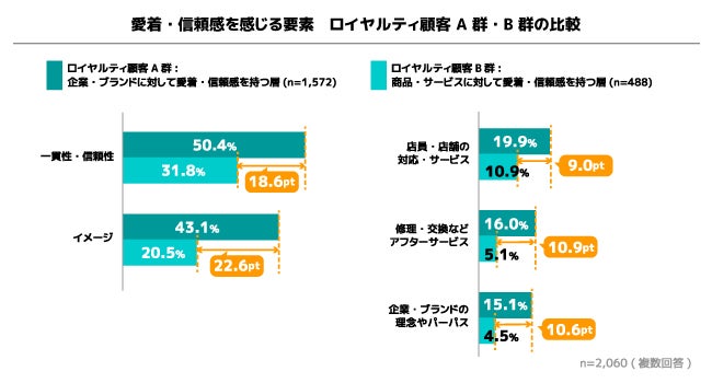 さらに愛着・信頼感を感じる要素を前述のA・B群に分類・比較したところ、離脱リスクの低いA群が重視する「信頼性」「ブランドイメージ」「対応・サービス」「アフターサービス」「企業理念・パーパス」などの「商品・サービス」そのものではない要素で2群間のギャップが生じたことから、信頼を与える企業のブランドイメージを確立し、顧客体験を強化する施策が有効と考えられます。