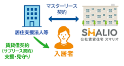 公社は、以下の事業を行う居住支援法人等とマスターリース契約(※)を締結することにより、公社賃貸住宅スマリオ(SMALIO)にて、住宅確保要配慮者にも安心な「居住サポート住宅」を提供することが可能となりました。