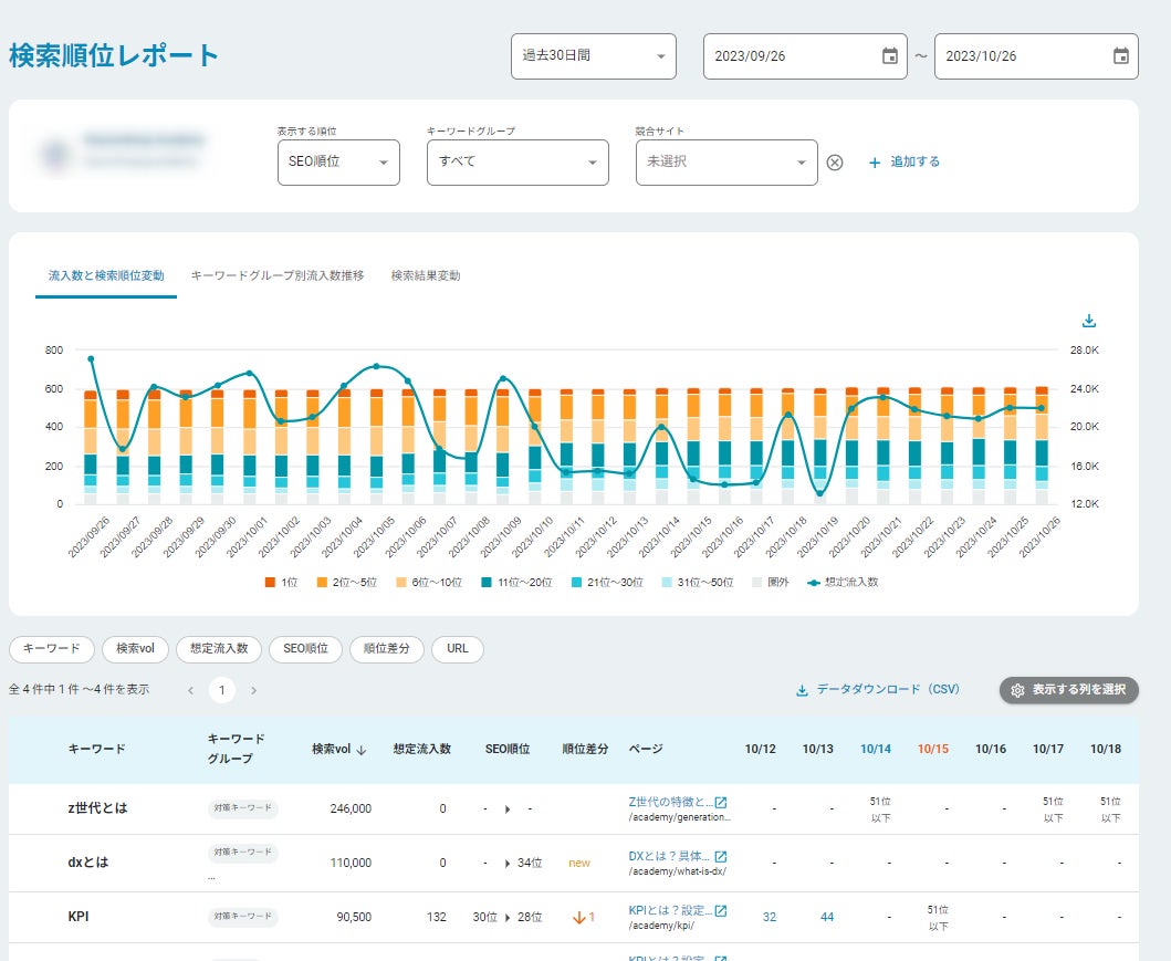 登録済みの注力しているキーワードの日次の動向に加え、サイト全体での想定流入数の推移と検査順位の変動も把握することができ、サイト全体の数値を基にした戦略策定・運用に役立ちます。また、自社のコンテンツ順位の上下から、キーワードグループごとに順位変動を追跡し、競合サイトと比較して重要キーワードの順位勝敗を一目で確認できるなど、キーワードの順位に焦点を当てた様々な調査が可能です。