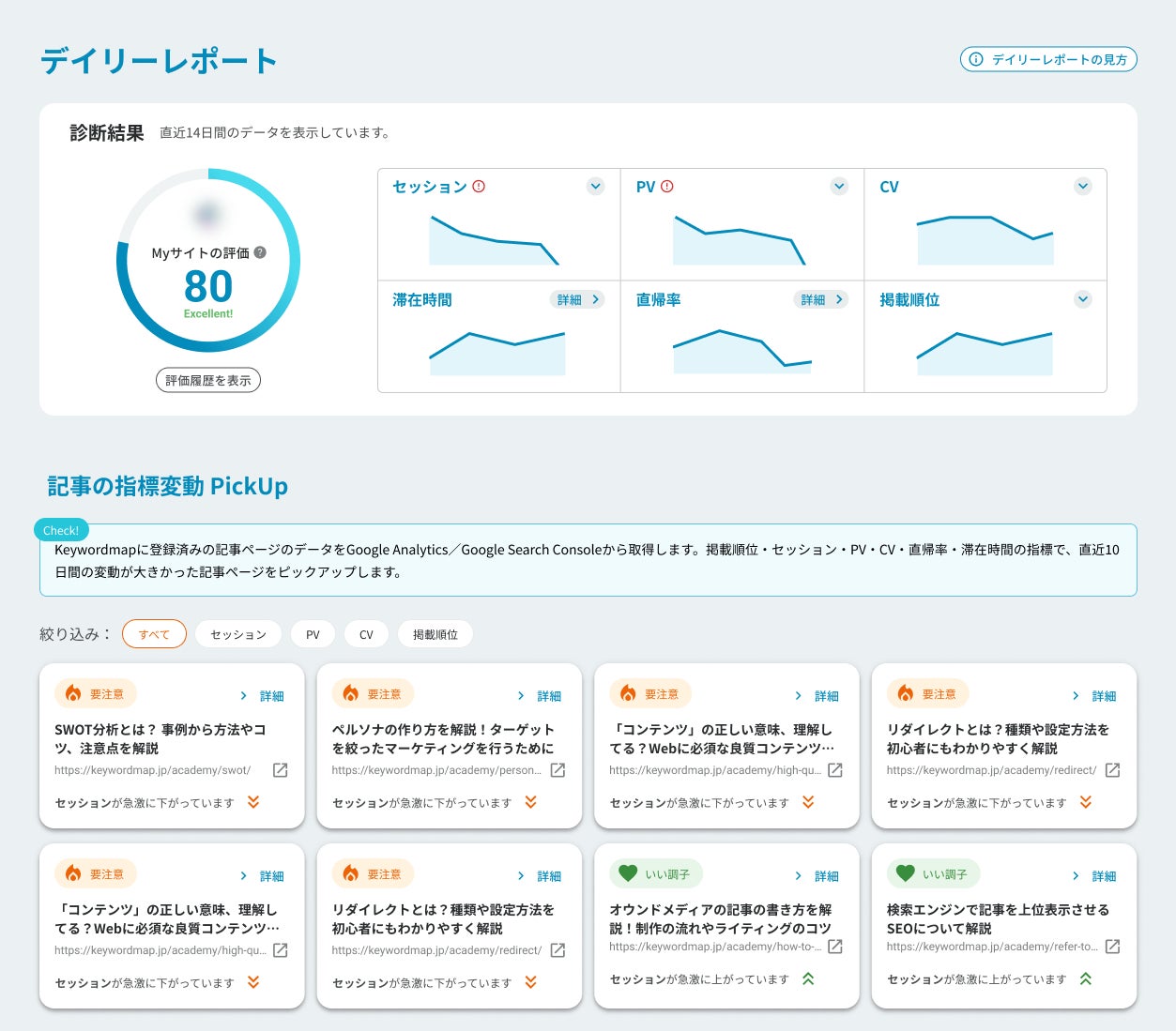 Google Analytics・Google Search ConsoleのデータをKeywordmapの順位データと組み合わせ、1つの画面で要点をまとめます。各指標(PV・CV等)から抽出された課題を、視覚的に短時間で把握できます。