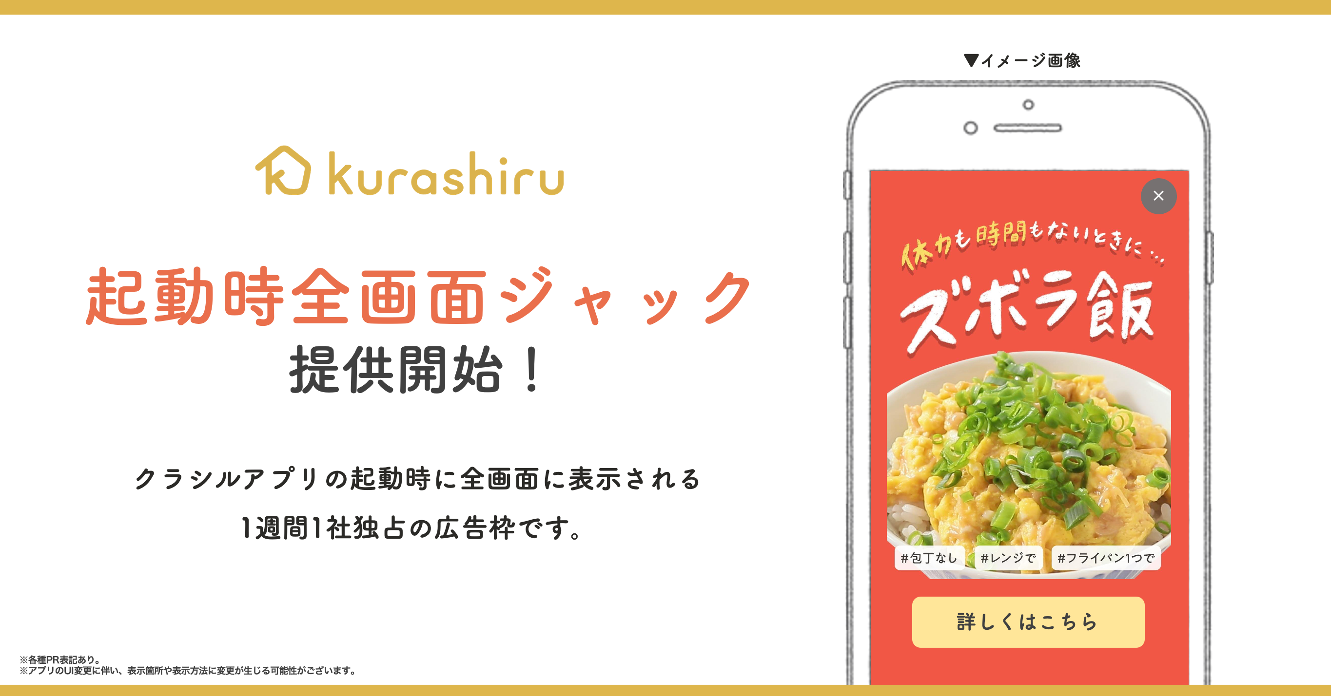 【アプリ利用者全員に確実にリーチ】「クラシル」アプリ起動時の全画面を、1社で独占できる広告メニュー「起動時全画面ジャック」を提供開始