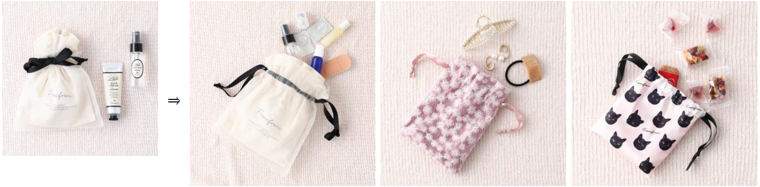 巾着バッグ(商品パッケージ)に細かな日常使いするアイテムをまとめて小さいバッグの中も整理整頓