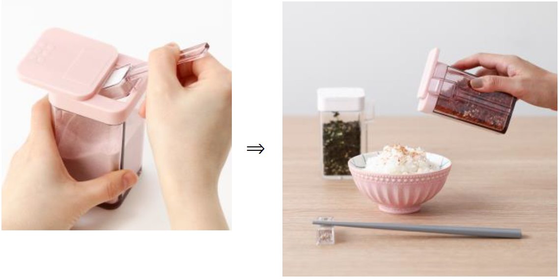 「小麦粉&スパイスボトル」にふりかけやごま塩を入れてお子さまでも安心お子さまでも持ちやすく、適量をふりかけられるので食卓の常設のアイテムに