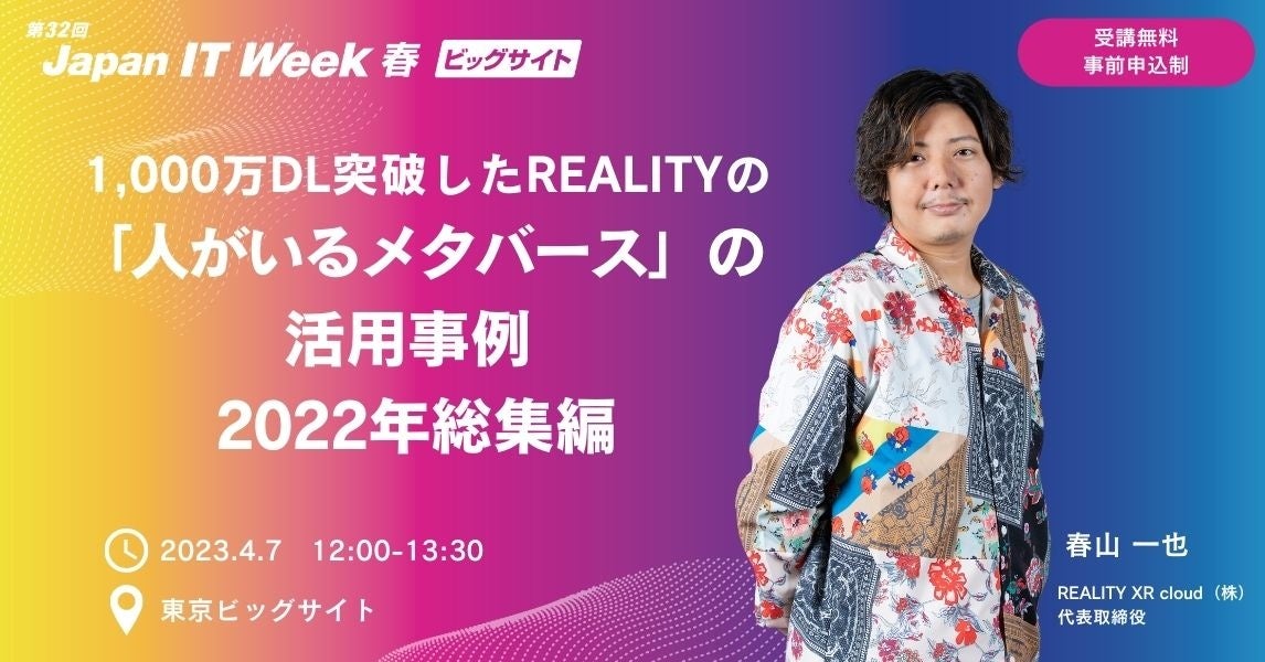 また、4月7日(金)の併催セミナーにて、REALITY XR cloud代表の春山が「1,000万DL突破したREALITYの”人がいるメタバース”の活用事例 2022年総集編」をテーマに登壇いたします。