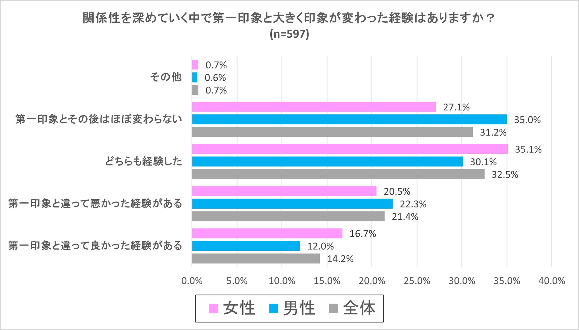最も多かった回答は、良くも悪くも「どちらも経験した」が全体で32.5%、男性30.1%、女性35.1%という結果となり、2番目もほぼ同数で「第一印象とその後はほぼ変わらない」が全体31.2%、男性35.0%、女性27.1%となりました。