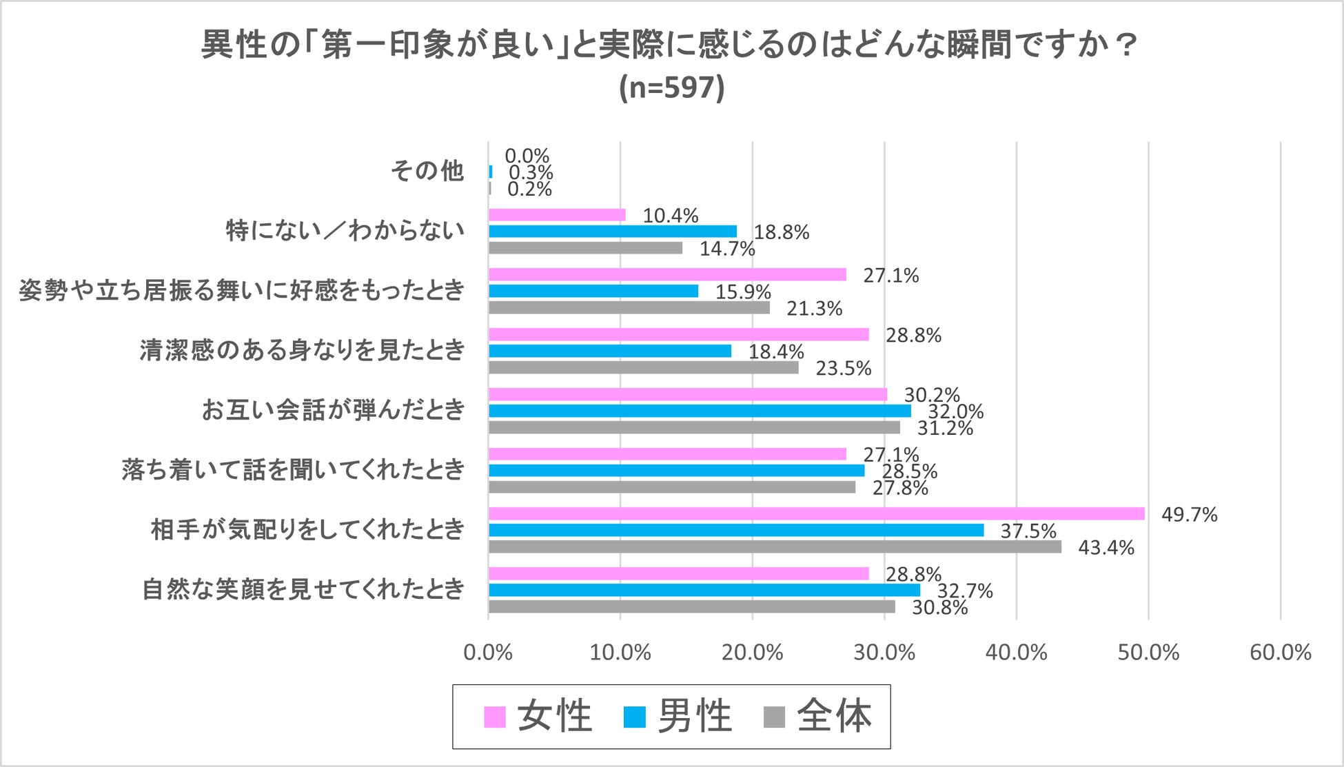 最も多かった回答は「相手が気配りをしてくれたとき」で全体43.4%、男性37.5%、女性49.7%という結果で、男女で比較すると女性の方が「気配り」について気にしていることがわかる結果となりました。