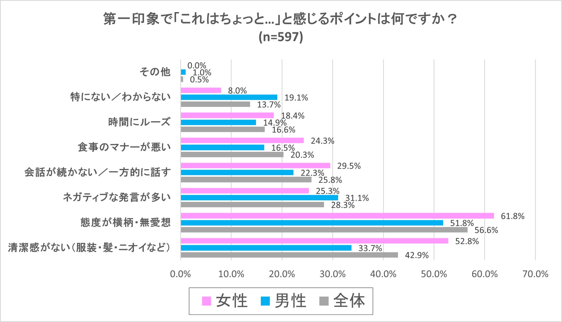 2番目に多かったのは「清潔感がない(服装・髪・匂いなど)」で、全体42.9%、男性33.7%、女性52.8%となり、男女で比較すると女性が20ポイント近く多い回答割合となりました。