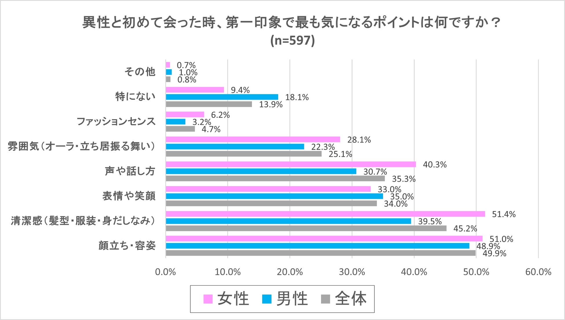 2番目に多かったのは「清潔感(髪型・服装・身だしなみ)」で、全体45.2%、男性39.5%、女性51.4%という結果で、女性の方が10ポイント近く多い結果となりました。