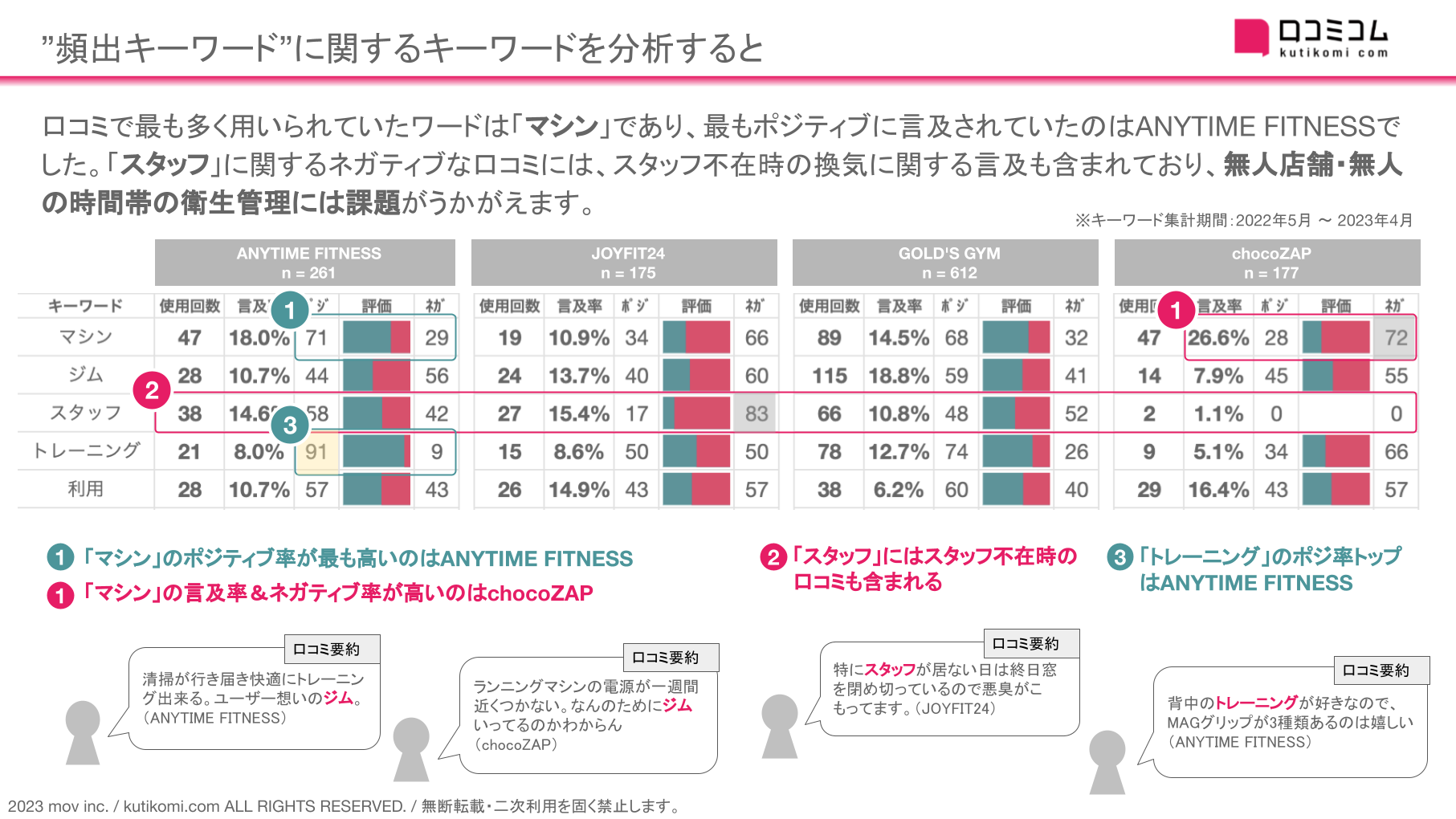 口コミで最も多く用いられていたワードは「マシン」であり、最もポジティブに言及されていたのはANYTIME FITNESSでした。