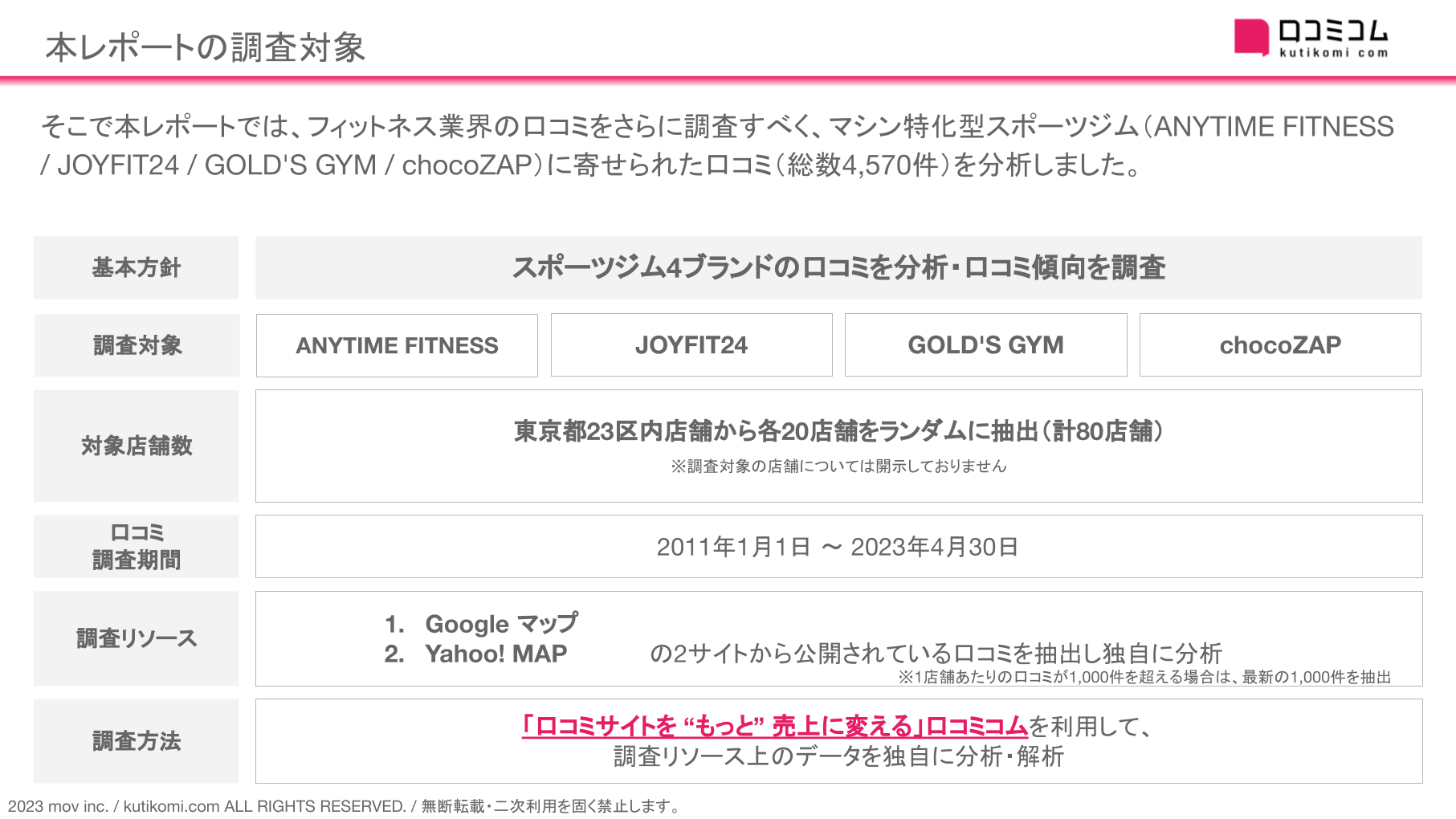 本レポートでは、フィットネス業界の口コミを調査すべく、マシン特化型スポーツジム(ANYTIME FITNESS / JOYFIT24 / GOLD'S GYM / chocoZAP)に寄せられた口コミ(総数4,570件)を分析しました。